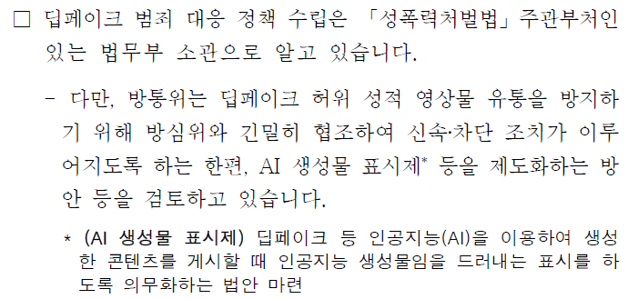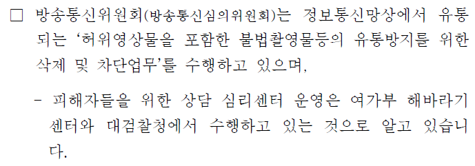그러나 방송통신위원회는‘딥페이크 범죄 대응정책 수립’이 법무부 소관이고, 피해자들을 위한 상담 심리센터 운영은 여성가족부와 대검찰청의 소관이라 하면서 불법 딥페이크 음란물 범죄 대응정책에 대한 예산을 편성하지 않고 있다고 밝혔다.
