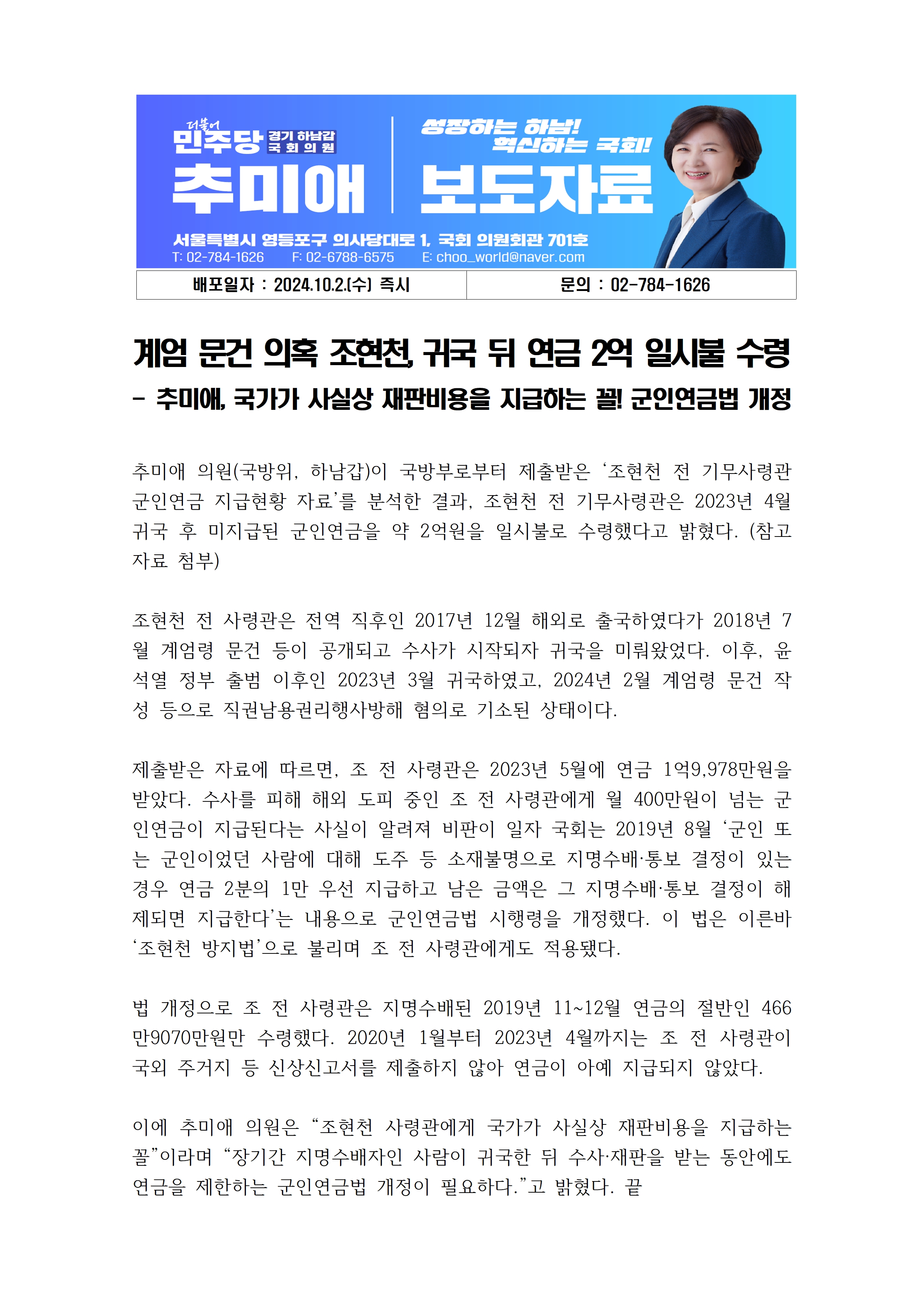 추미애_보도자료_계엄문건_의혹_조현천_연금_2억_일시불_수령_.hwp