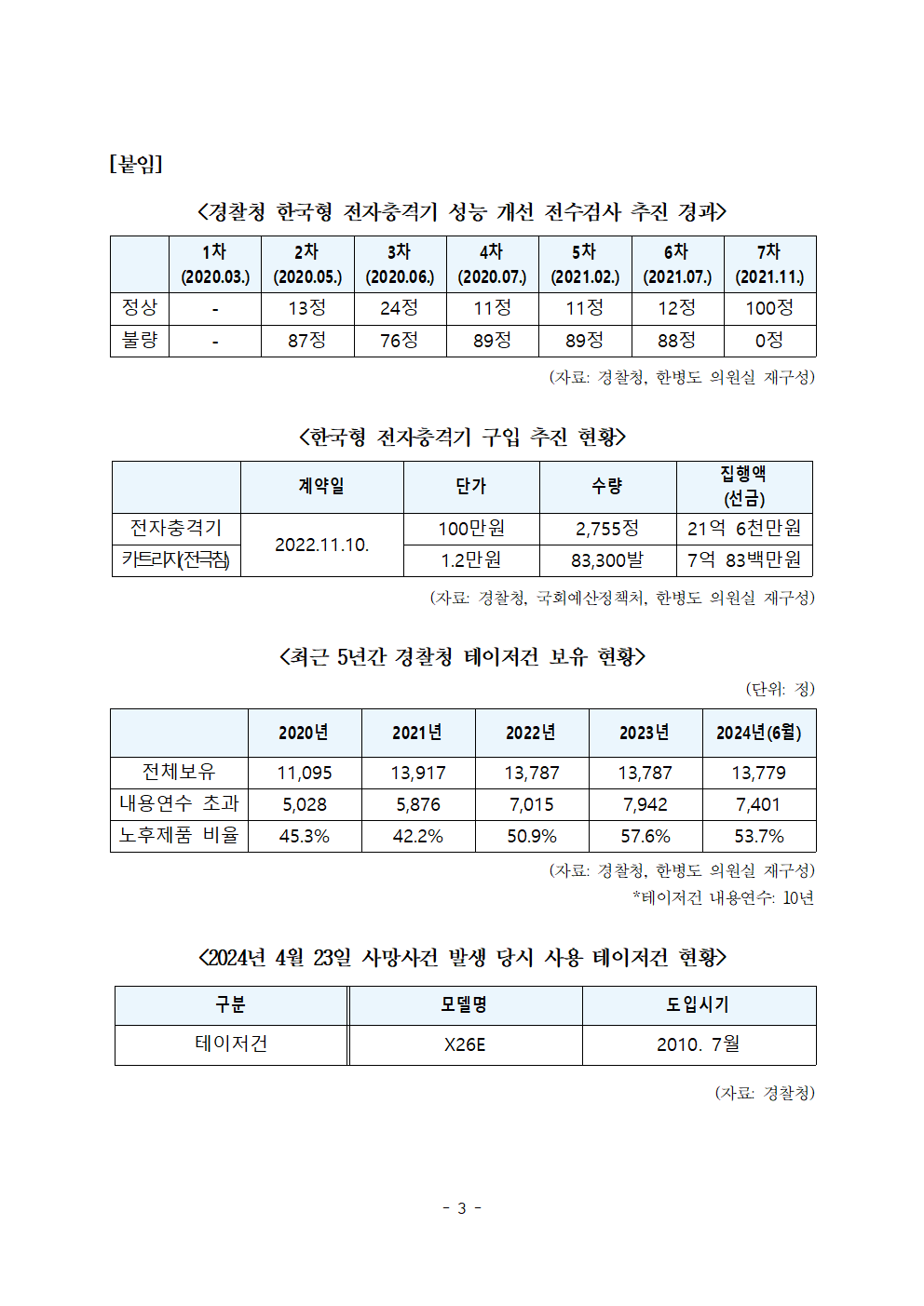 [한병도의원]2024행안위국정감사보도자료(33)테이저건 2대 중 1대 노후 제품인데... 경찰청 한국형 전자충격기는 도입 불발.hwp