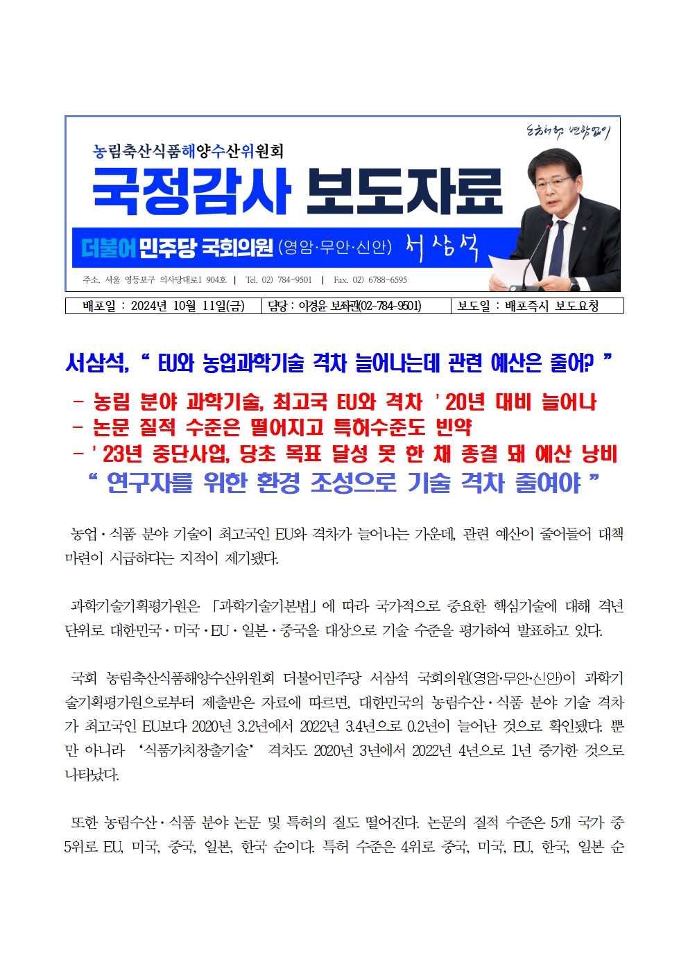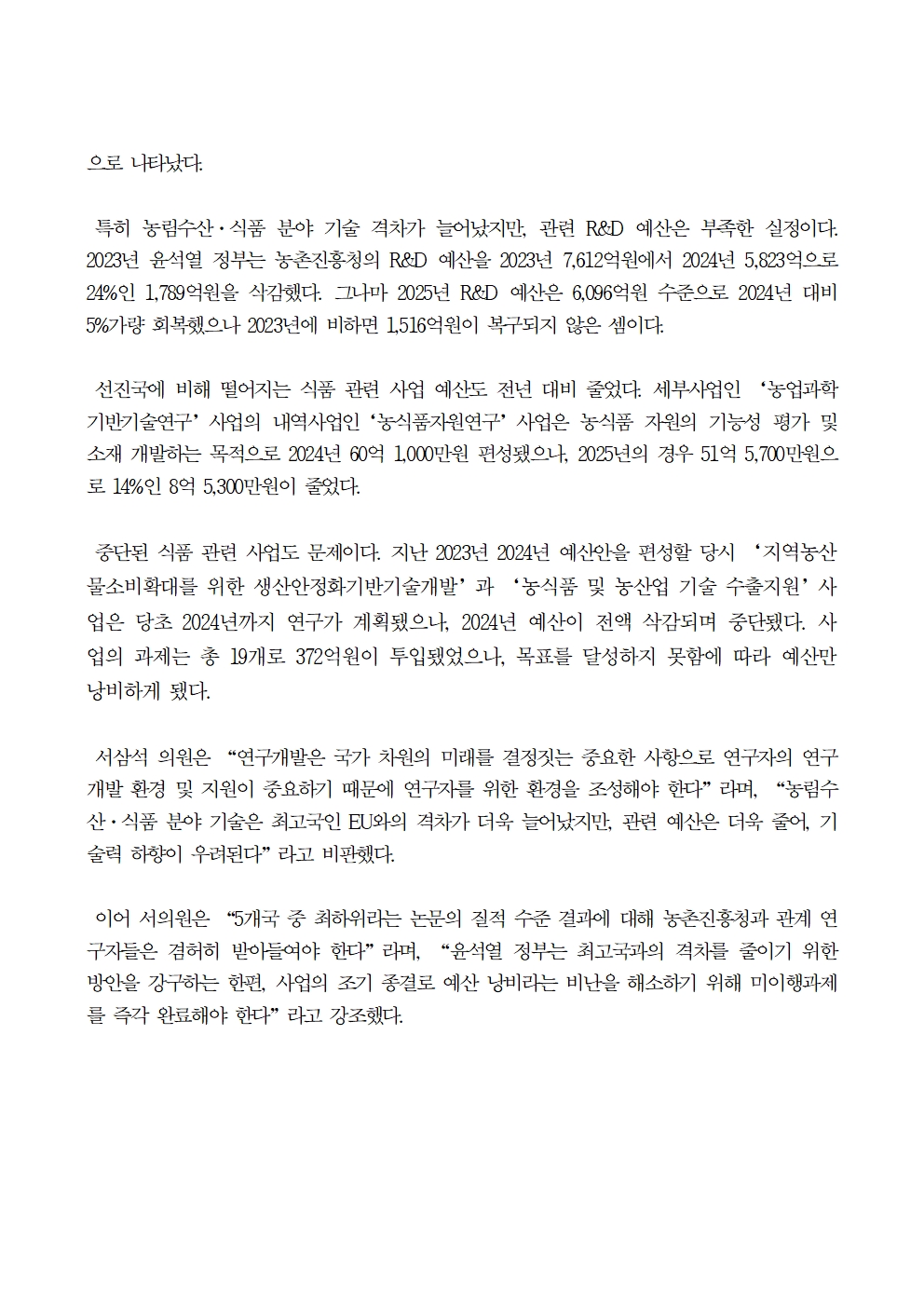 [국회의원 서삼석] EU와 농업과학기술 격차 늘어나는데 관련 예산은 줄어