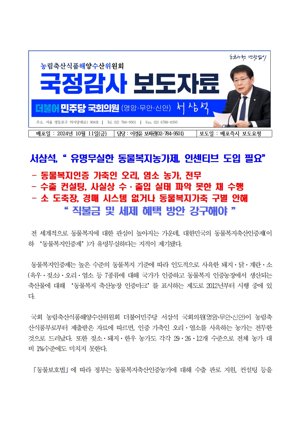[국회의원 서삼석] 유명무실한 동물복지농가제 인센티브 도입 필요