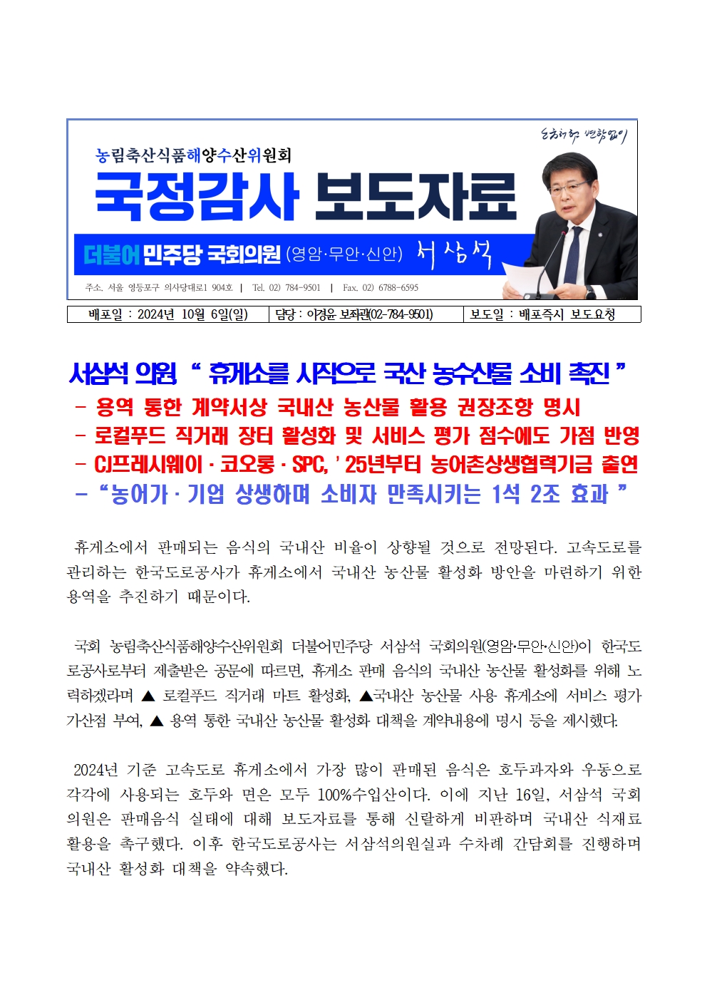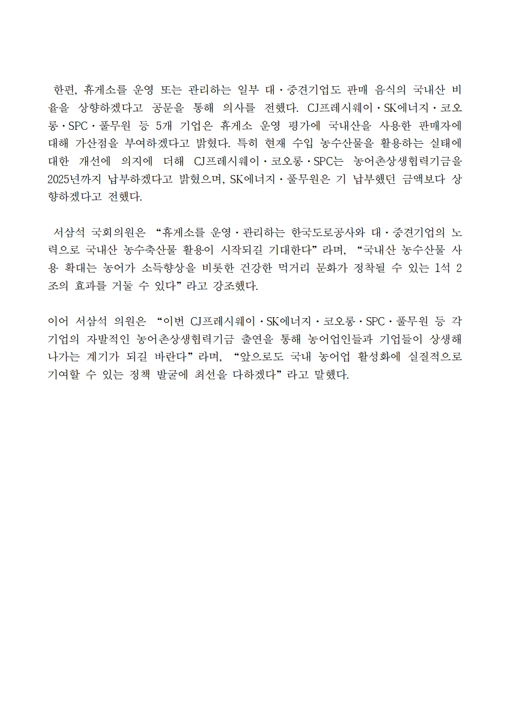 [국회의원 서삼석] 휴게소를 시작으로 국산 농수산물 소비 촉진