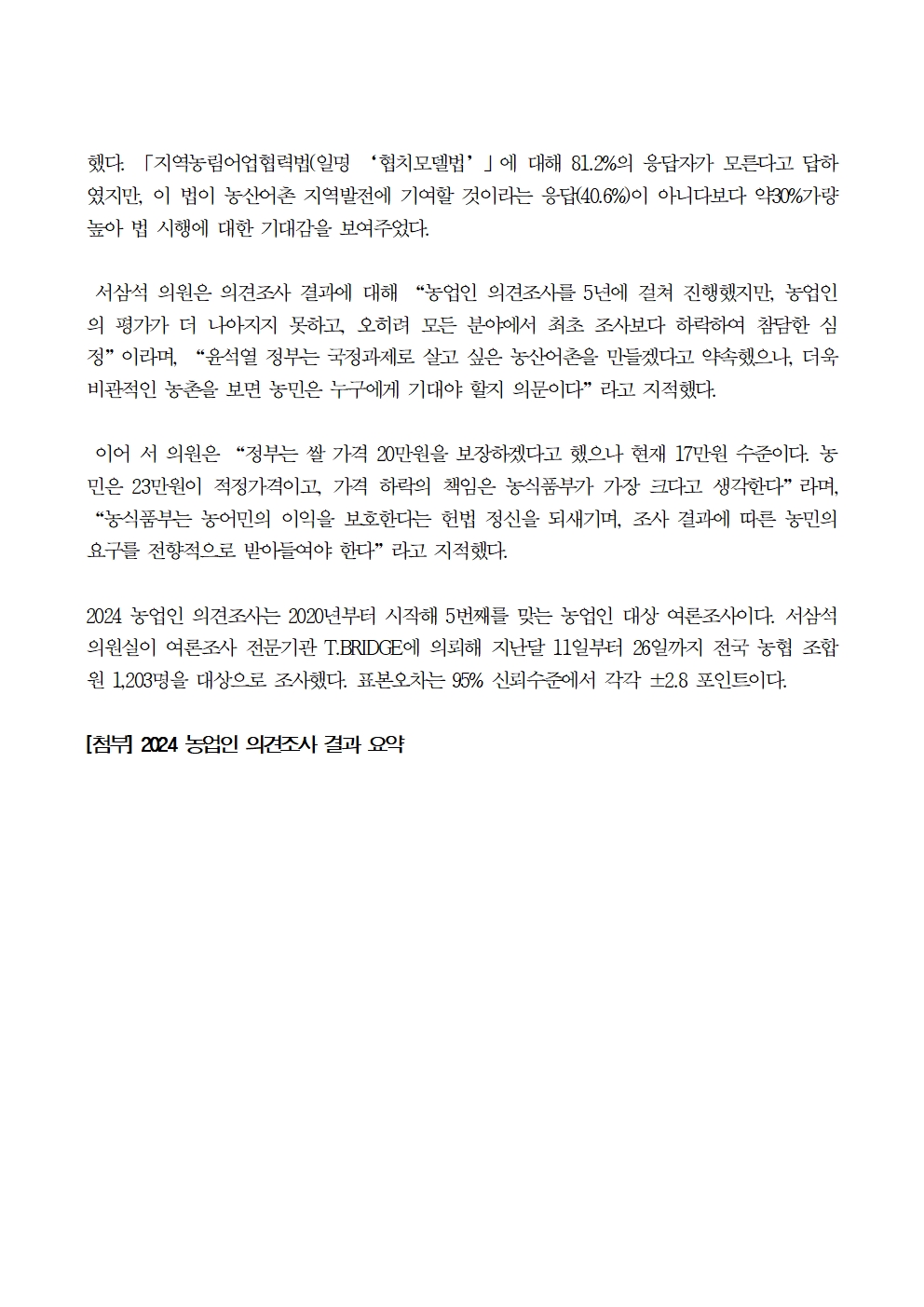 [국회의원 서삼석] 농업인 의견조사_갈수록 비관적인 한국 농정
