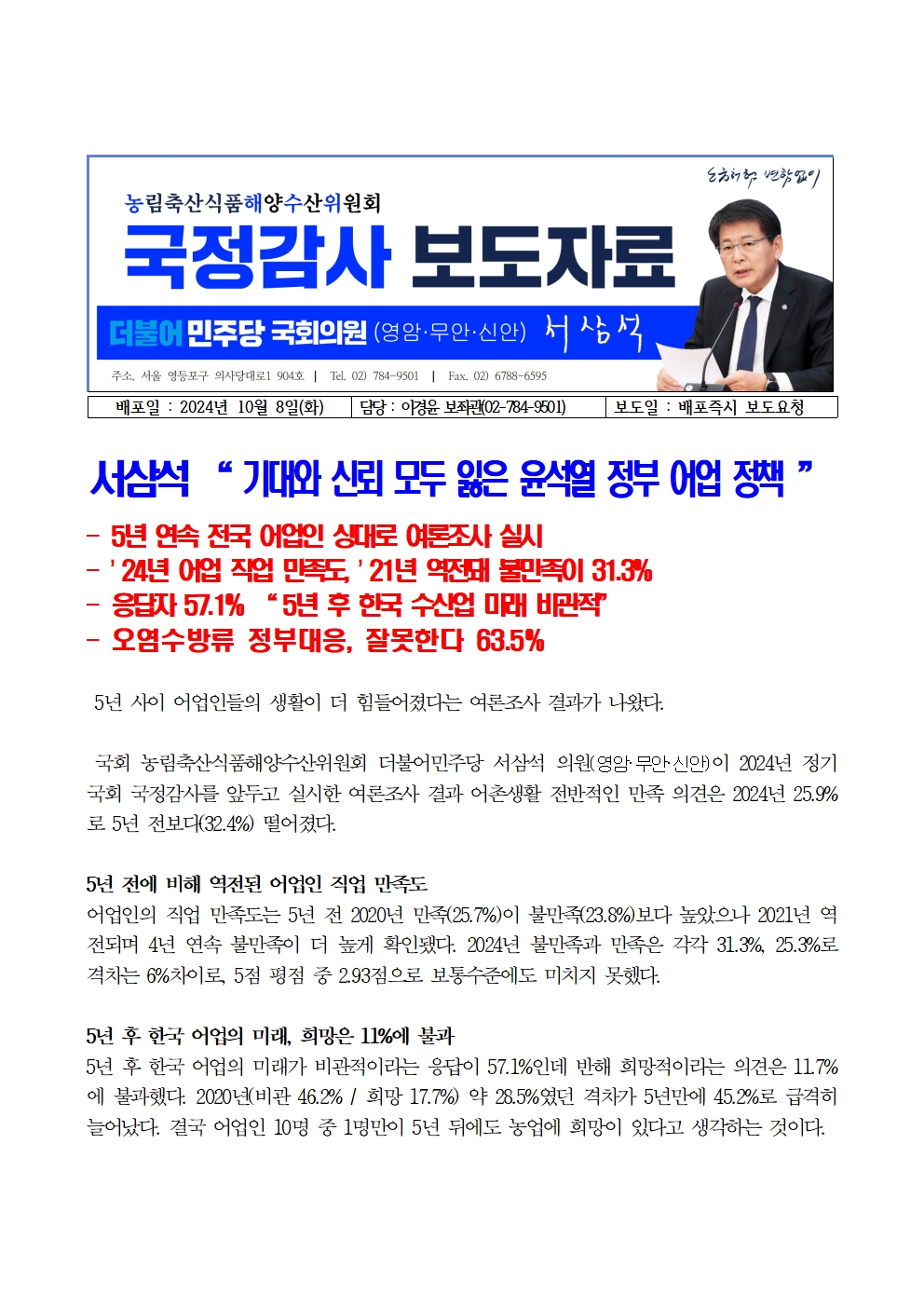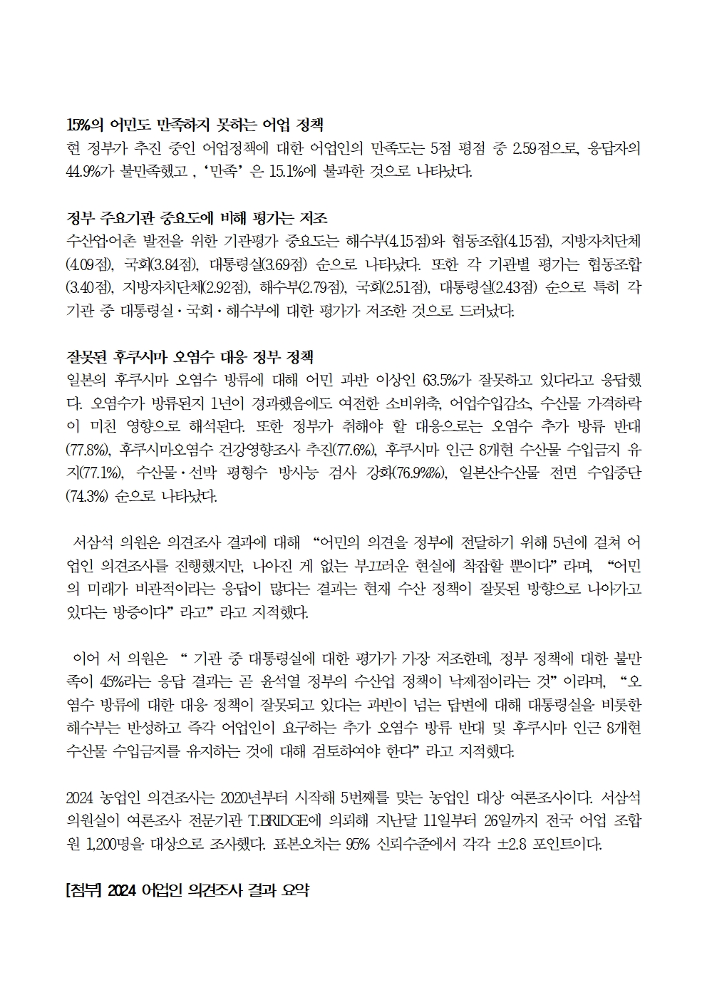 [국회의원 서삼석] 어업인 의견조사_기대와 신뢰 모두 잃은 윤석열 정부 어업 정책