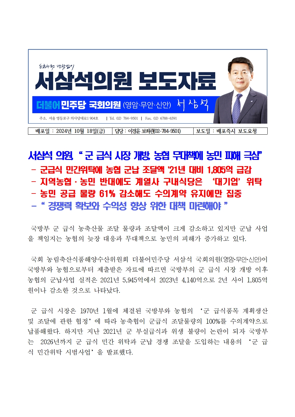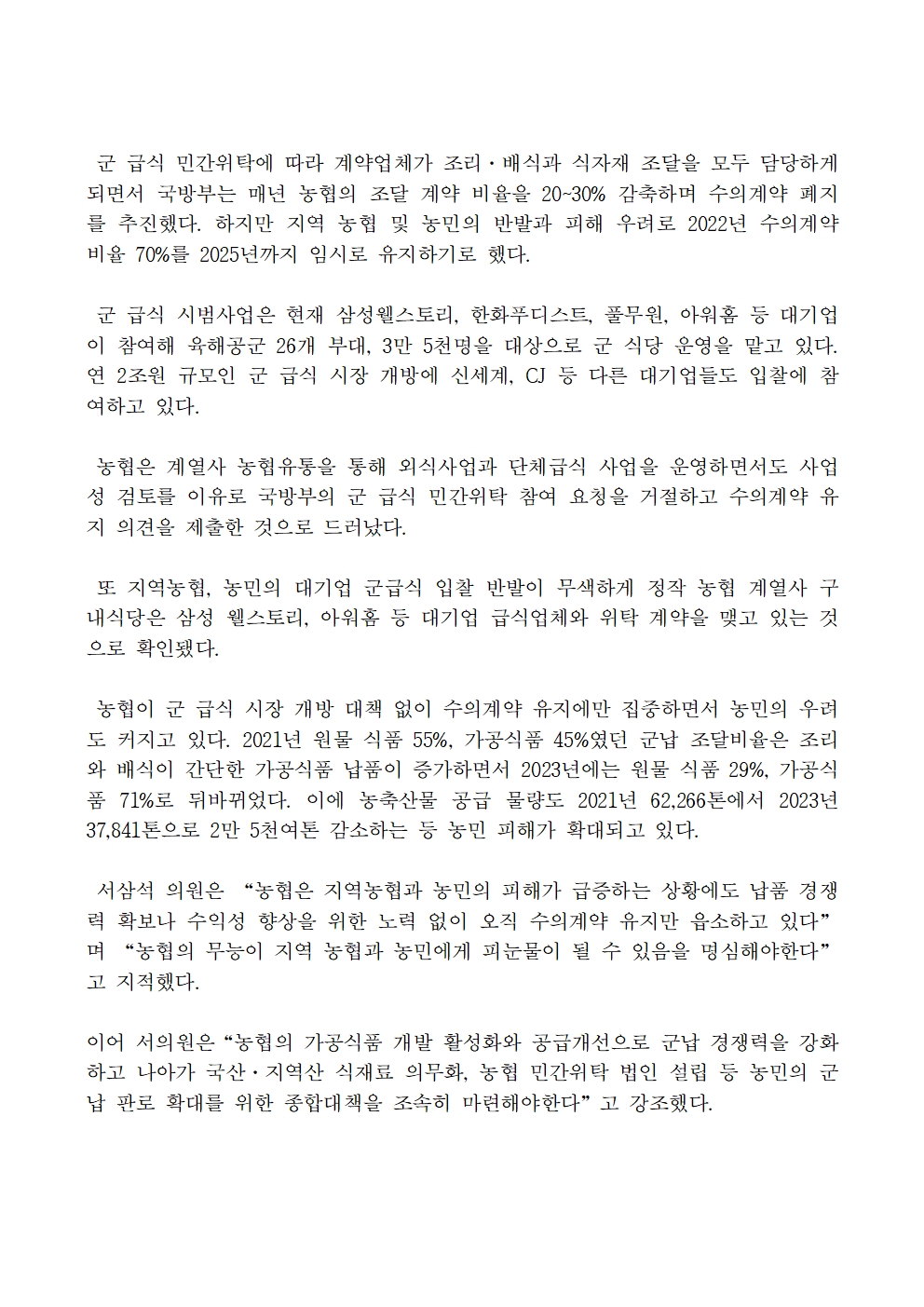 [국회의원 서삼석] 군 급식 시장 개방, 농협 무대책에 농민 피해 극심