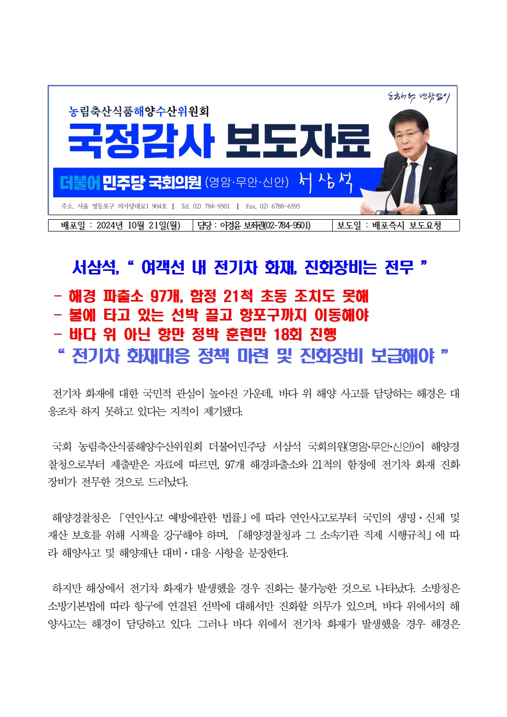 [국회의원 서삼석] 여객선 내 전기차 화재 진화장비는 전무