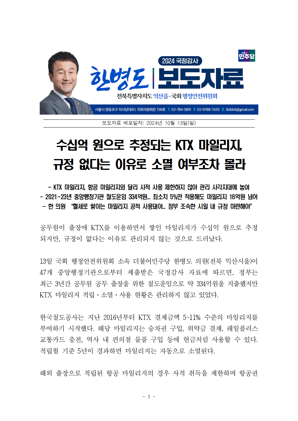 [한병도의원]2024행안위국정감사보도자료(34)수십억 원으로 추정되는 KTX 마일리지 규정 없다는 이유로 소멸 여부조차 몰라.hwp