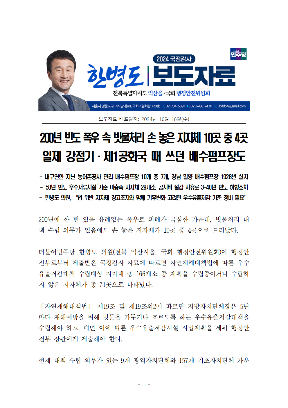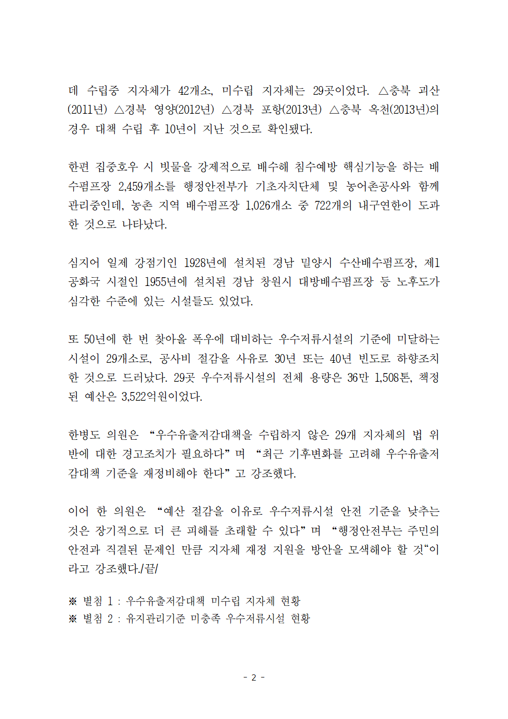 [한병도의원]2024행안위국정감사보도자료(38)200년 빈도 폭우 속 빗물처리 손 놓은 지자체 10곳 중 4곳... 일제 강점기·제1공화국 때 쓰던 배수펌프장도.hwp