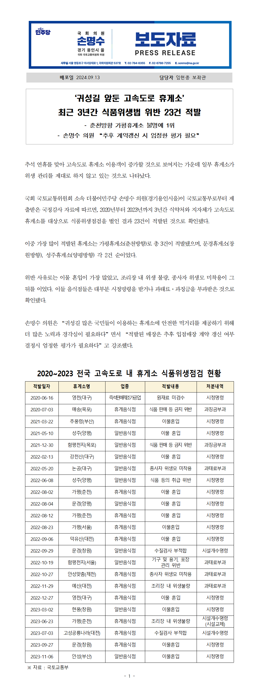 240913_손명수의원실_보도자료_귀성길_앞둔_고속도로_휴게소_최근_3년간_식품위생법_위반_23건_적발.hwp