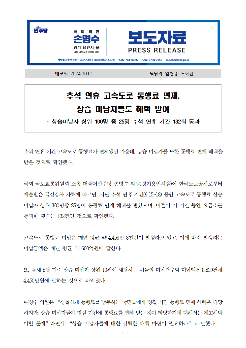 241001_손명수의원실_보도자료_추석_연휴_고속도로_통행료_면제_상습_미납자들도_혜택_받아.hwp