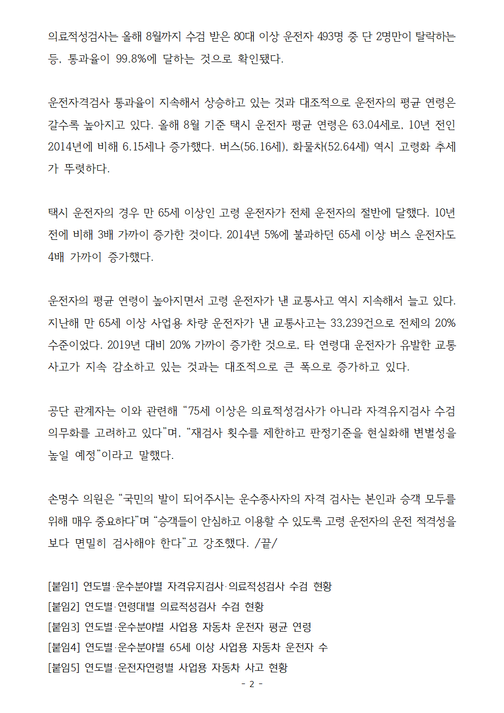 [국회의원 손명수] 택시기사 절반이 고령운전자... 운전자격검사 통과율 99% '있으나마나'