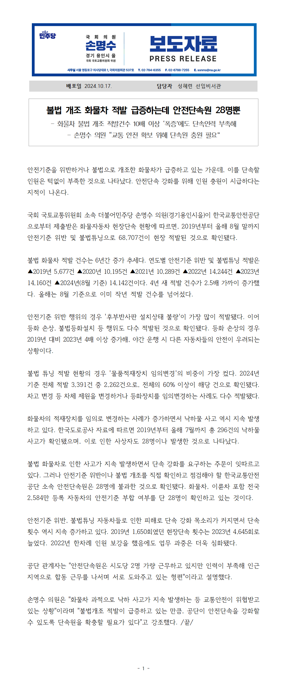 241017_손명수의원실_보도자료_화물차불법개조적발급증_손명수의원실.hwp
