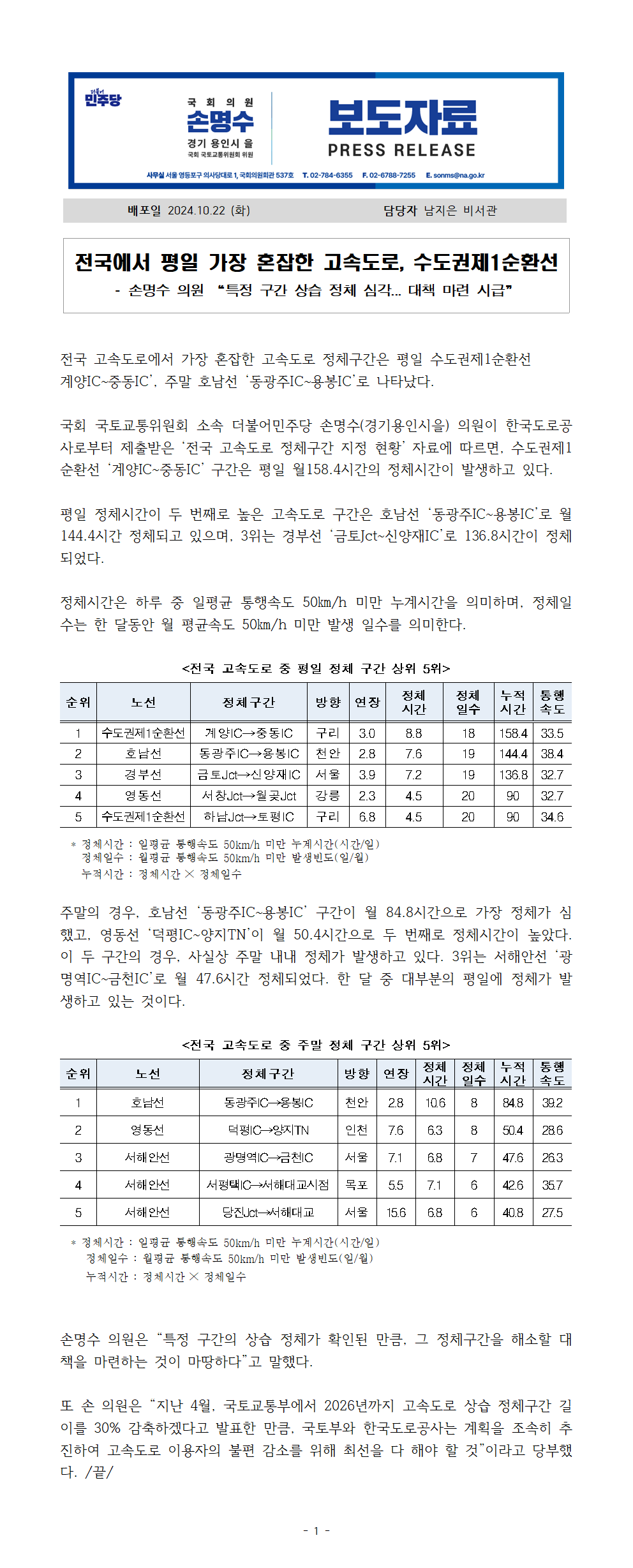 241022_손명수의원실_보도자료_전국에서_가장혼잡한고속도로_수도권제1순환선.hwp