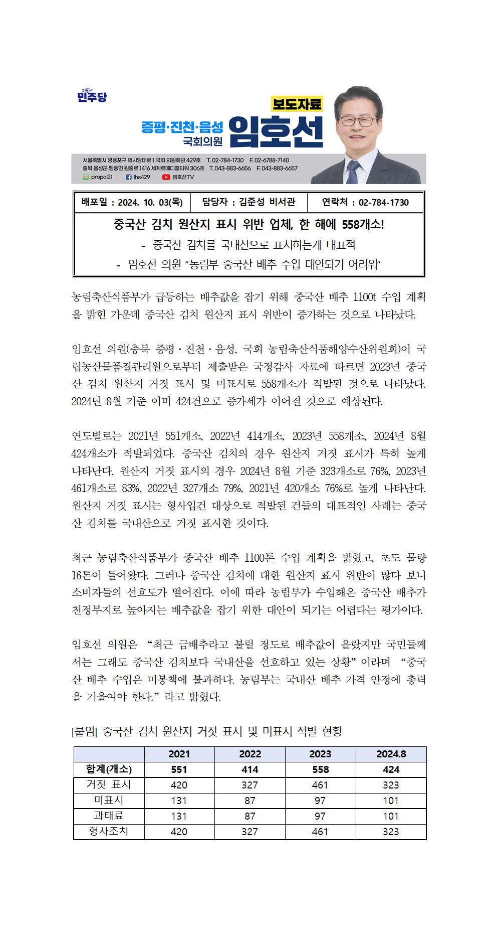 [국회의원 임호선] 중국산 김치 원산지 표시 위반 업체, 한 해에 558개소!
