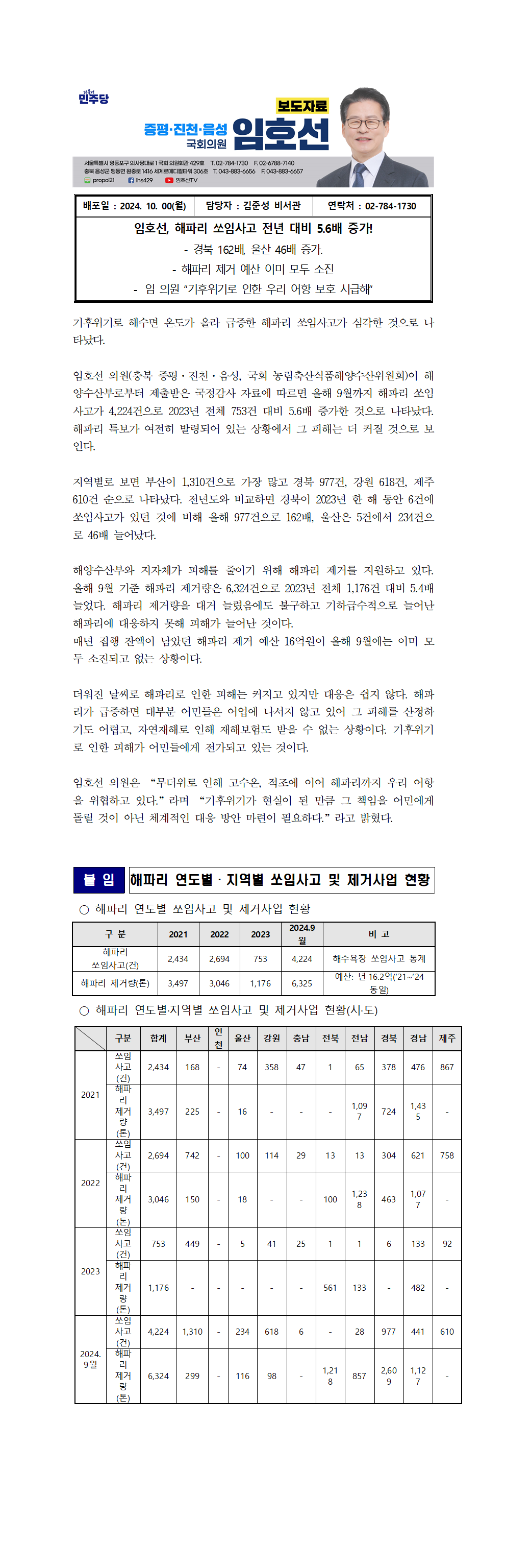 [국회의원 임호선] 해파리 쏘임사고 전년 대비 5.6배 증가!