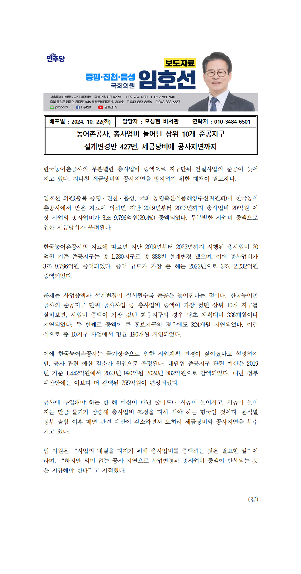 [국회의원 임호선] 농어촌공사, 총사업비 늘어난 상위 10개 준공지구 설계변경만 427번, 세금낭비에 공사지연까지