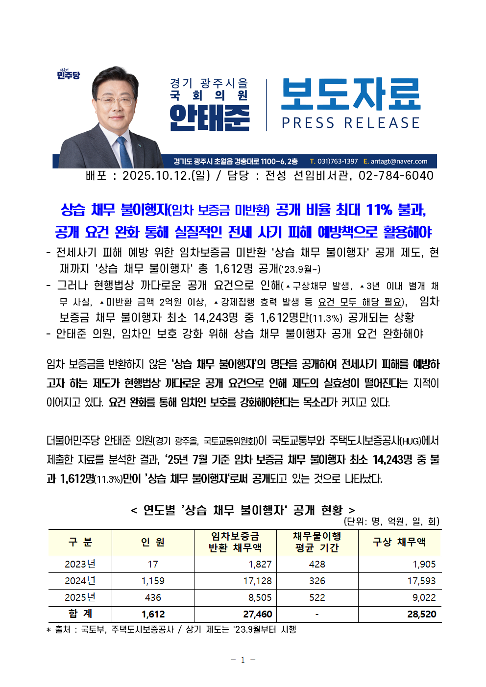 251012 (안태준 의원 보도자료) 2. 상습 채무 불이행자 공개 비율 11% 불과 공개 요건 완화해야.hwp