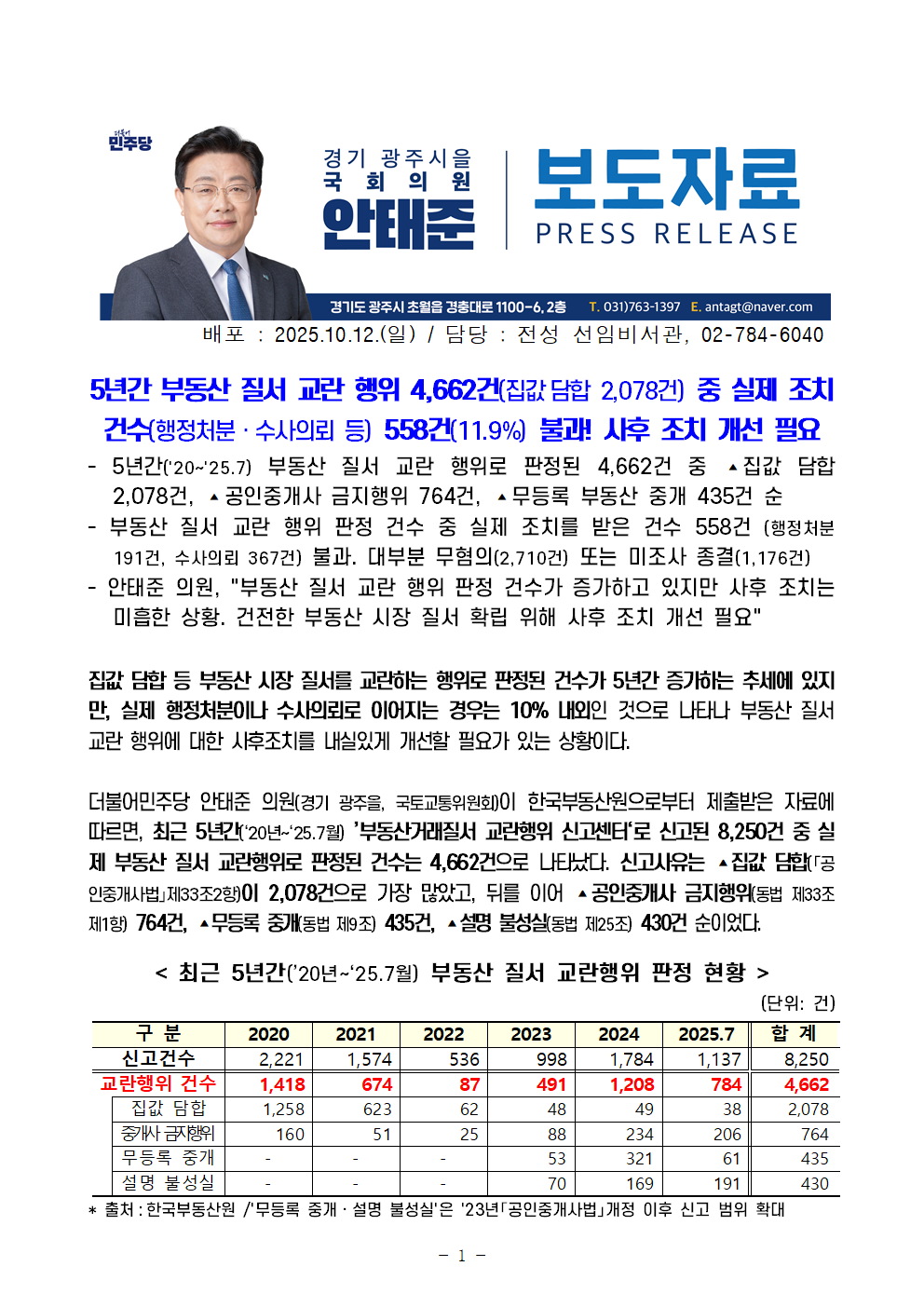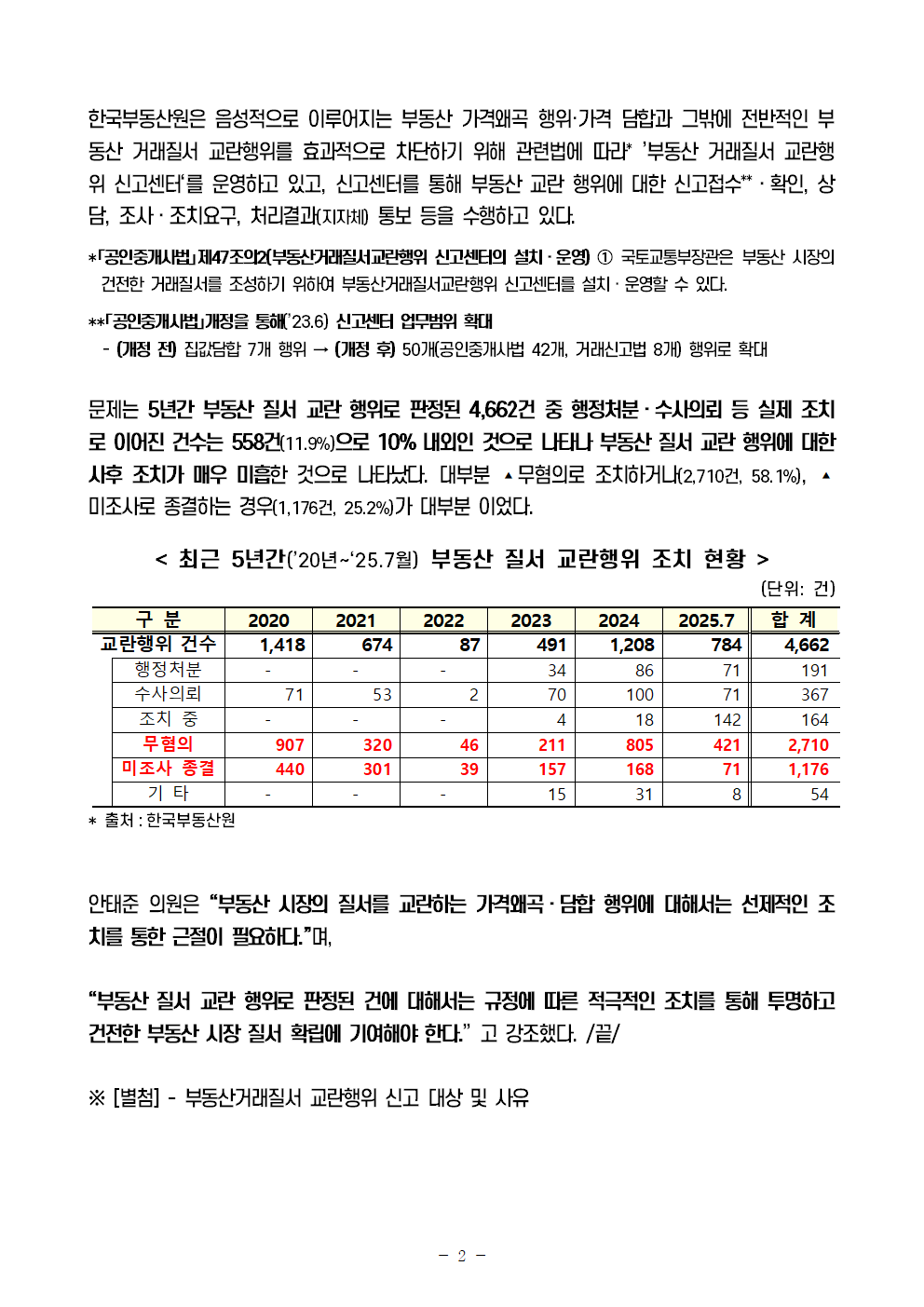 251012 (안태준 의원 보도자료) 8. 부동산 질서 교란 행위 5년간 4662건 중 실제 조치 건수 558건(11.9%) 불과!.hwp