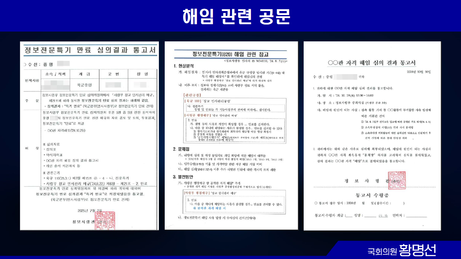안규백 국방부 장관은 내란에 연루된 것이 밝혀지면 취소할 것을 전제로 인사를 단행했다며, “면밀히 검토하겠다고 답변했다. 황명선 의원은 이에 군 대다수는 국가와 국민을 위해 헌신하고 있지만, 소수의 내란세력이 군 명예를 실추시키고 있다내란세력 척결을 위한 철저한 인사 관리를 당부했다. /