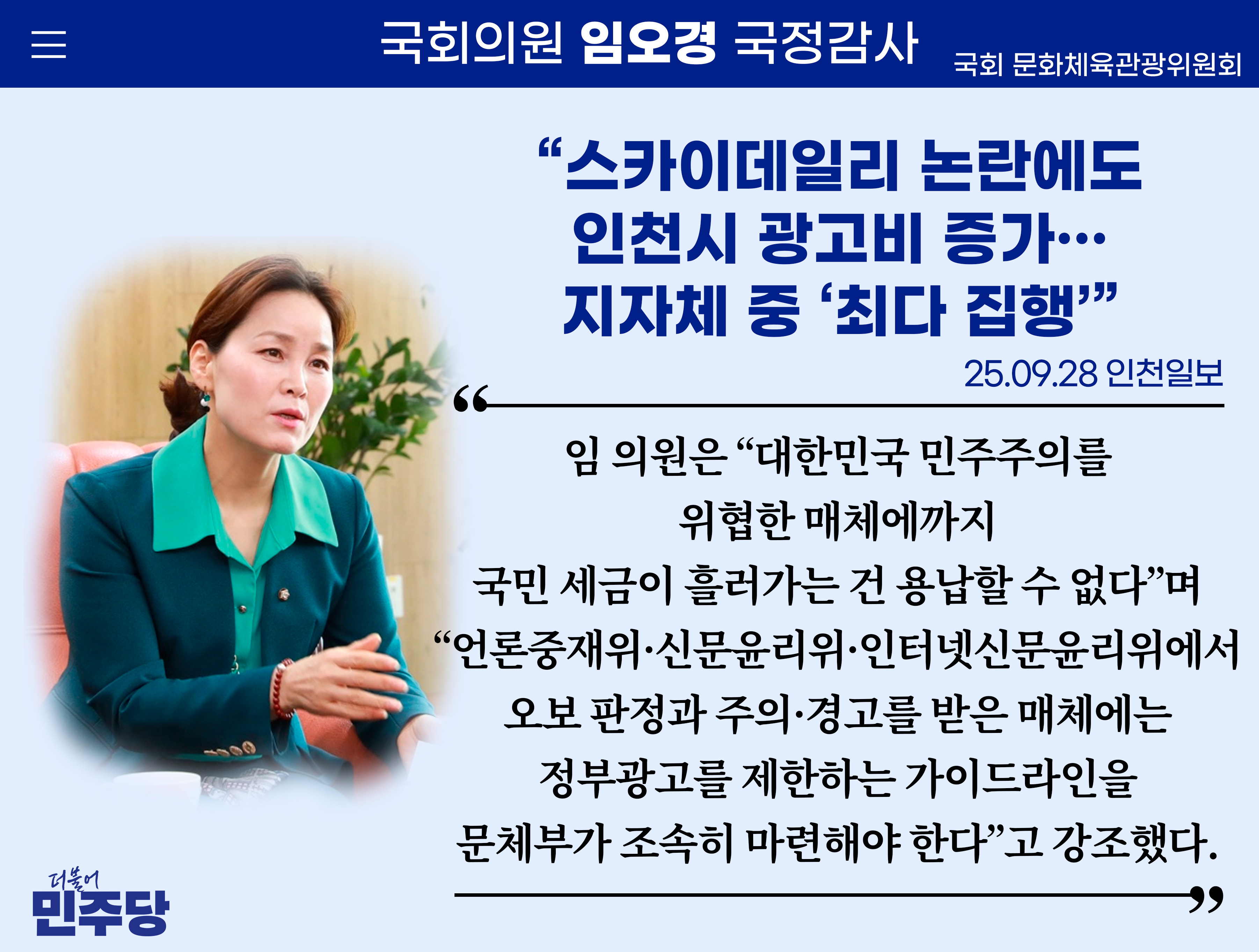 [임오경 카드뉴스]인천일보 / “스카이데일리 논란에도 인천시 광고비 증가…지자체 중 ‘최다 집행’”