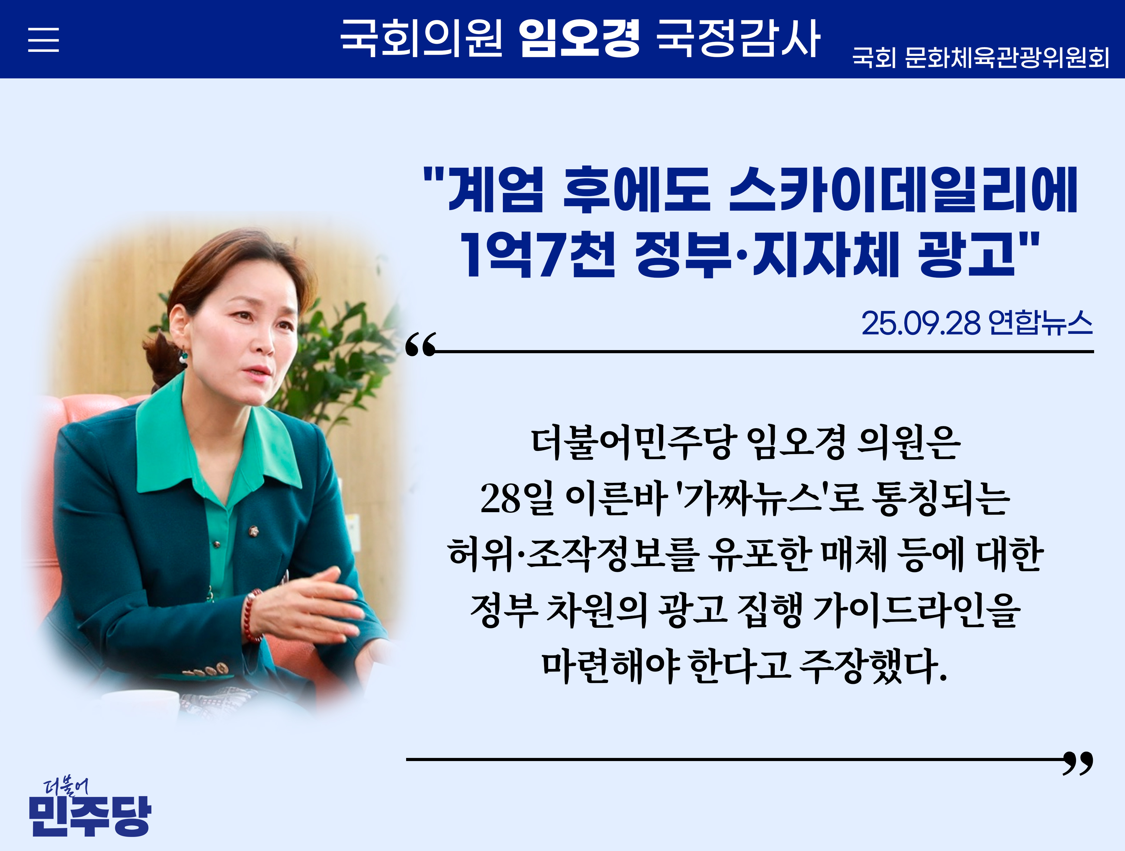 [임오경 카드뉴스]연합뉴스 / 임오경 "계엄 후에도 스카이데일리에 1억7천 정부·지자체 광고"