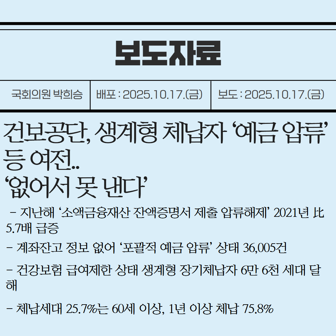 [국회의원 박희승 보도자료] 건보공단, 생계형 체납자 ‘예금 압류’ 등 여전.. ‘없어서 못 낸다’