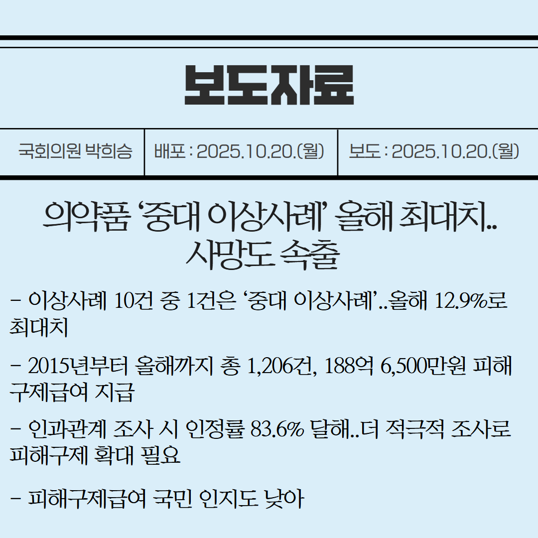[국회의원 박희승 보도자료] 의약품 ‘중대 이상사례’ 올해 최대치..사망도 속출