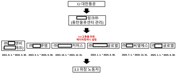 경기 화성시 동탄물류센터를 관리하는 인력공급업체 A업체에는 CJ대한통운과 물류도급계약을 체결했다. 그런데 외국인 근로자들이 한국어를 잘 모른다는 점을 이용해 페이퍼컴퍼니를 만들어 사용자책임을 회피하고, 근로계약서 작성 대신 사업소득세를 징수했다.
