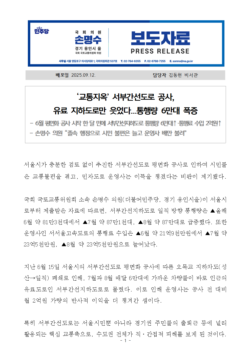 [국회의원 손명수 보도자료] ‘교통지옥’ 서부간선도로 공사, 유료 지하도로만 웃었다...통행량 6만대 폭증