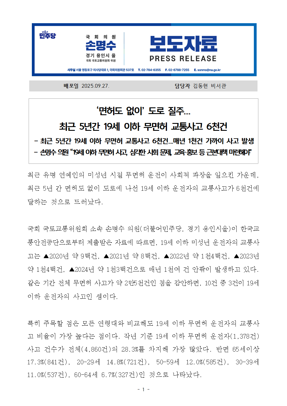 250927_면허도_없이_도로질주_5년간_19세이하_무면허교통사고_6천건_손명수의원.hwp
