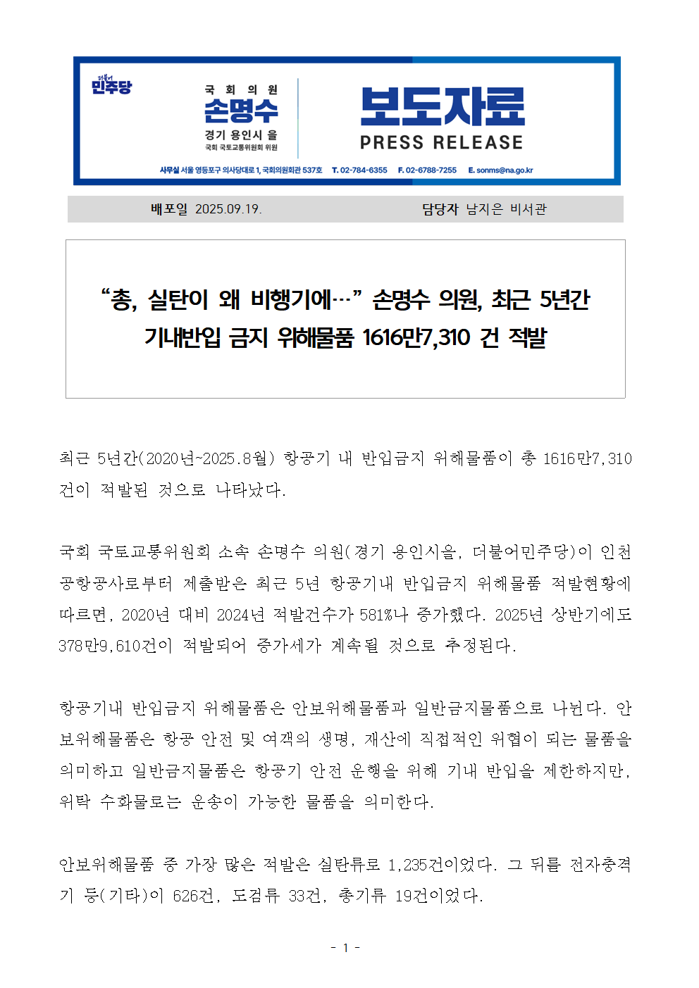 250919_손명수의원_항공기내반입_위해물품_최근5년간_1616만7310건_적발.hwp