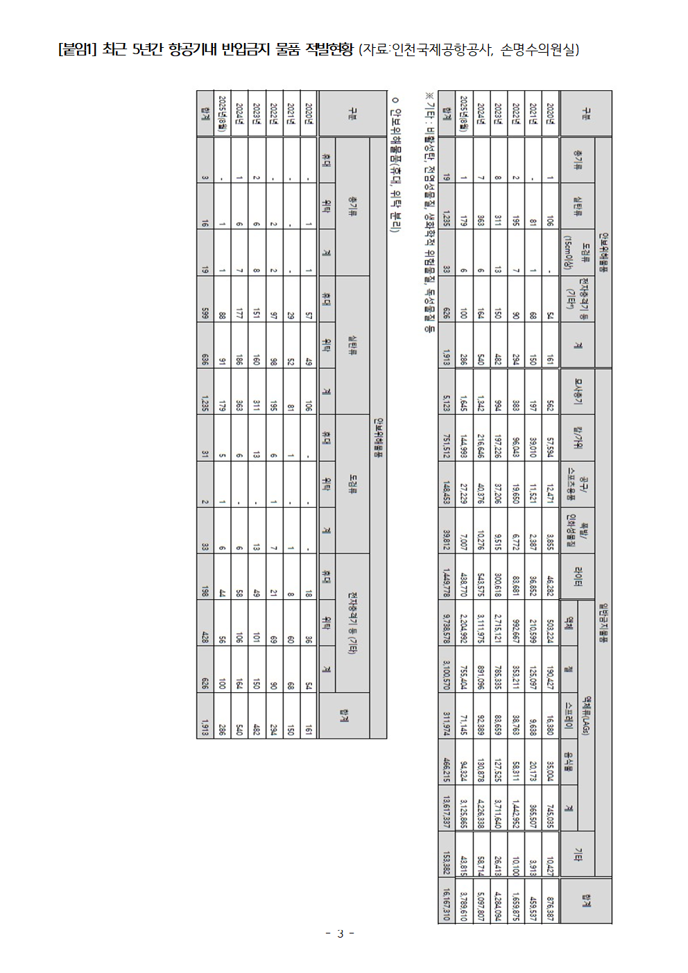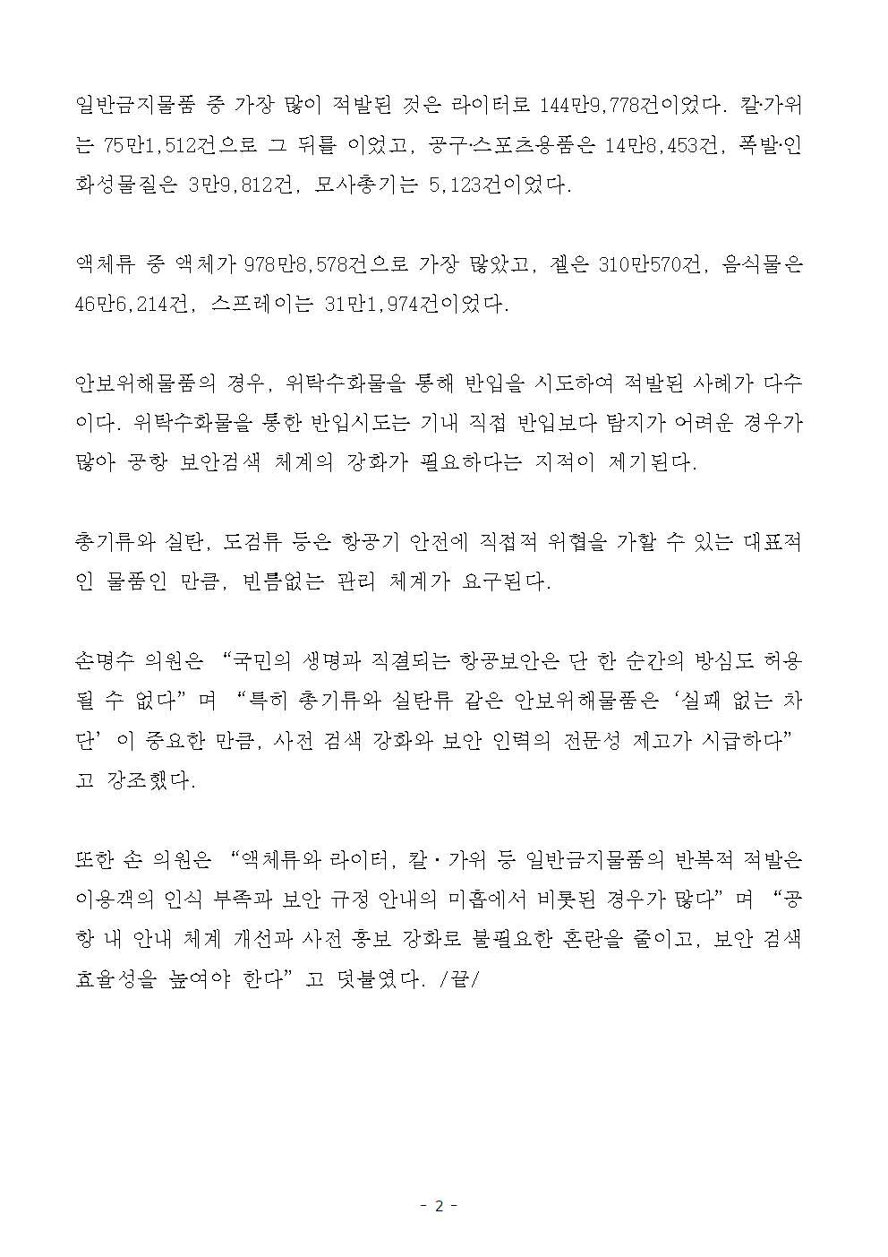 [국회의원 손명수 보도자료] “총, 실탄이 왜 비행기에…” 손명수 의원, 최근 5년간 기내반입 금지 위해물품 1616만7,310 건 적발
