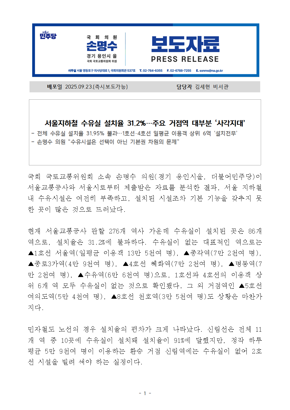 250923_서울지하철_수유실_설치율_31_2%_주요_거점역_대부분_사각지대_손명수의원.hwp