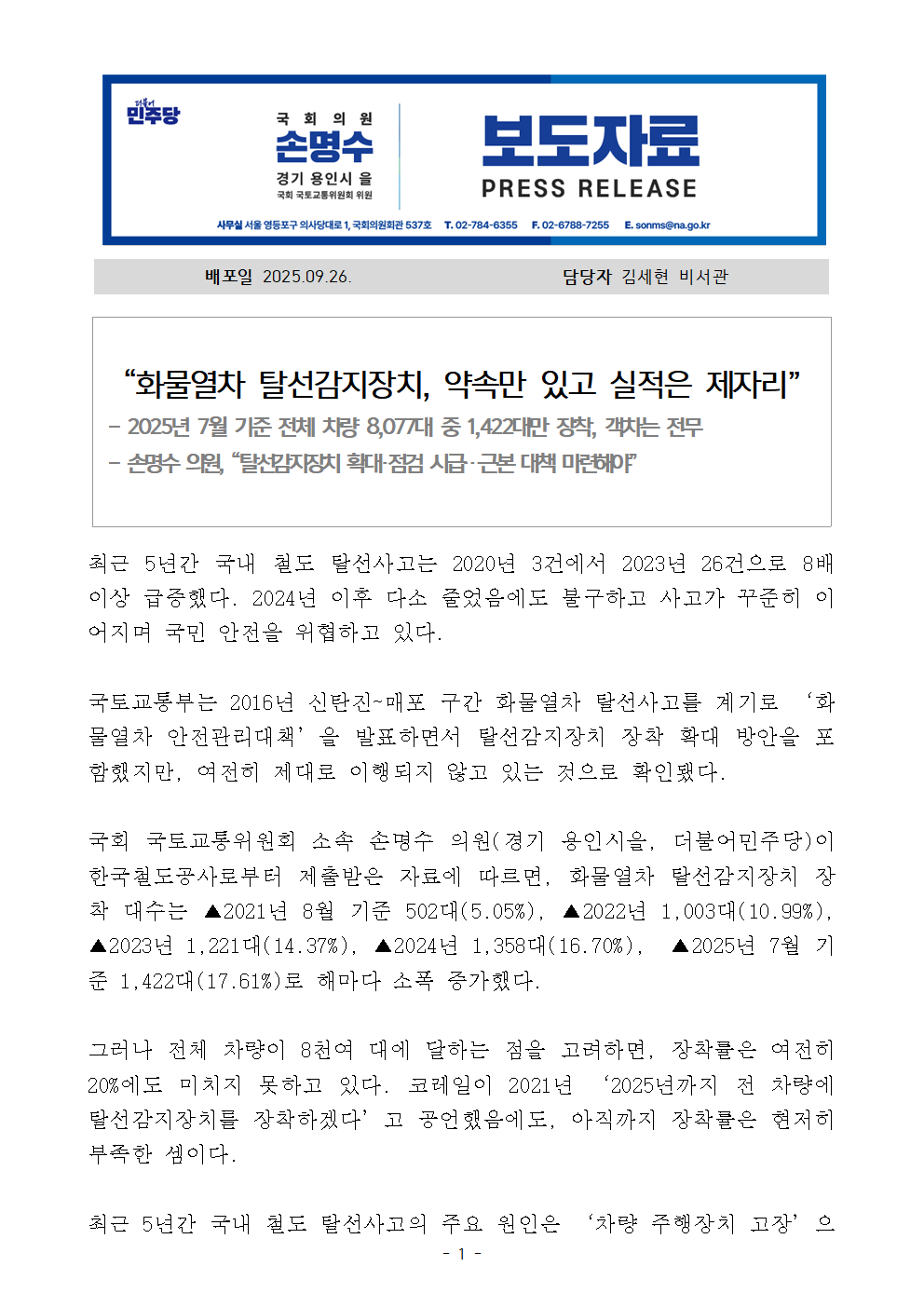 [국회의원 손명수 보도자료] “화물열차 탈선감지장치, 약속만 있고 실적은 제자리”