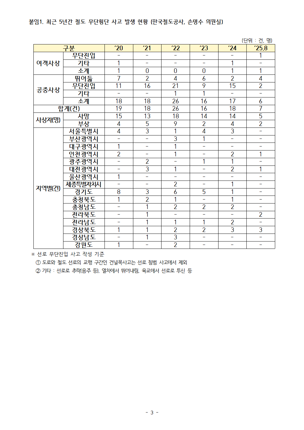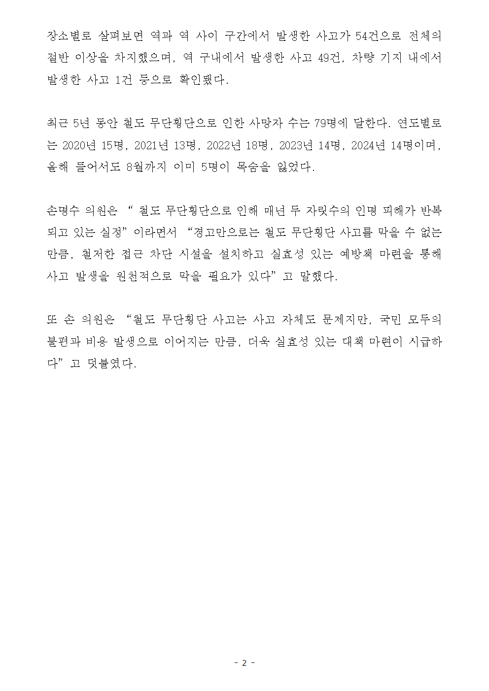 [국회의원 손명수 보도자료] 철도 무단횡단 사고 최근 5년간 104건... 경기가 23건으로 최대