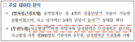 이와 관련해 코레일은 ‘당초 선로점검차 운전원과 무선통보를 통해 협의 후 출발’했다고 보고를 해 왔으나, 구로역 사고 전 무전 내역(그림 2)을 확인한 결과, 정작 현장 작업자들은 무선통보 체계에서 빠져 있었기 때문에 인접 선로의 열차 운행 상황을 인지할 수 없었던 상황이었다.