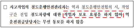 코레일은 두 사고 모두 ‘작업자들이 작업자 보호요청을 하지 않았기 때문에 작업구간 진입 철도차량에 대한 무선 통보를 하지 않았다’고 설명했다(그림 4). 그러나 한준호 의원이 조사한 바에 따르면, 해외의 경우 작업을 시작하기 전에 운행정보 등을 사전에 공유하도록 의무화돼 있는 것으로 나타났다.