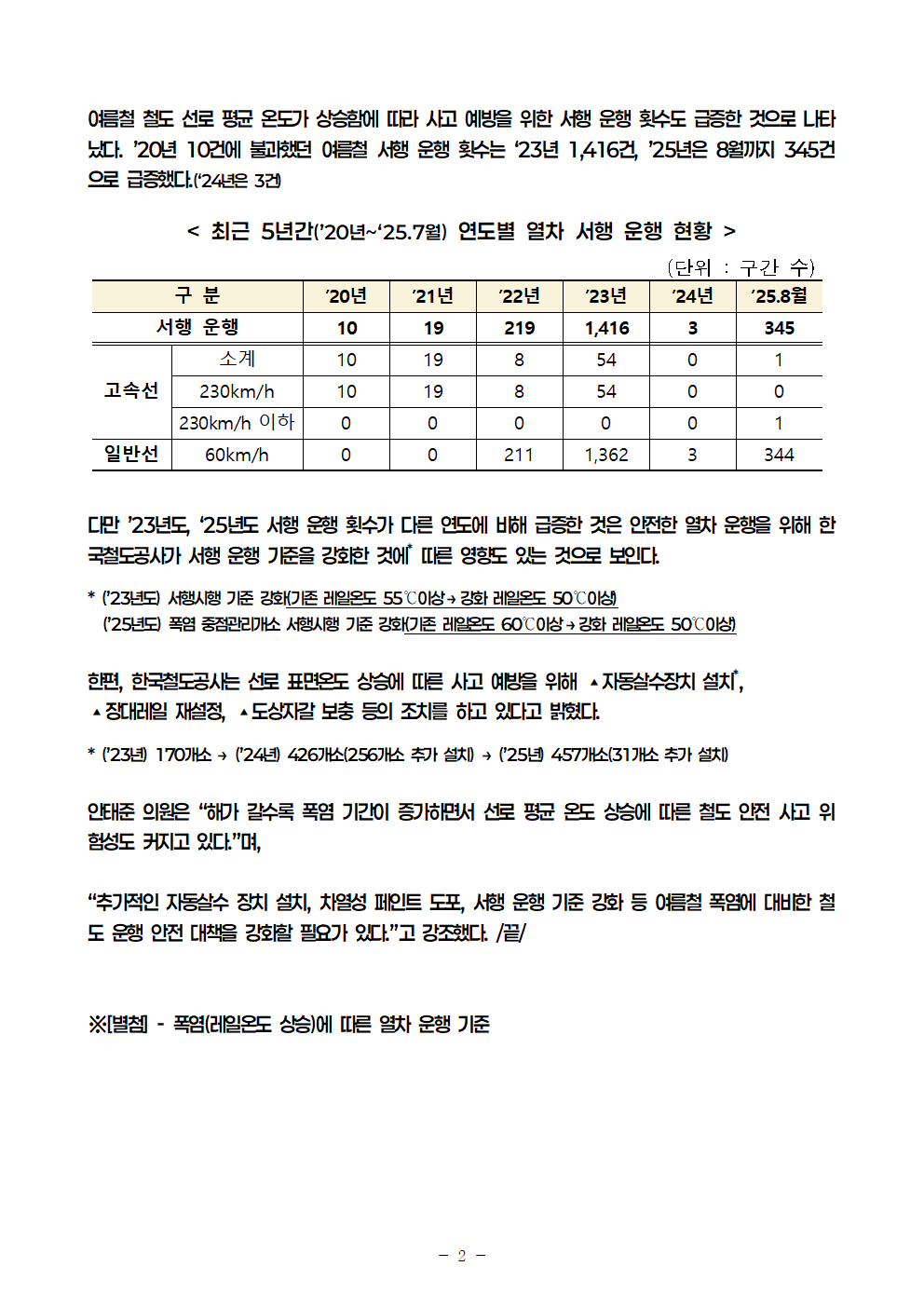 251021_안태준_의원_보도자료_여름철_철로_온도_5년간_10도_가까이_상승_서행운행_횟수도_급증!.hwp