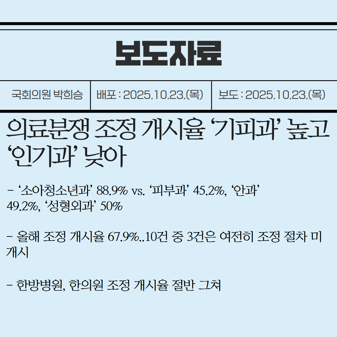 [국회의원 박희승 보도자료] 의료분쟁 조정 개시율 ‘기피과’ 높고 ‘인기과’ 낮아