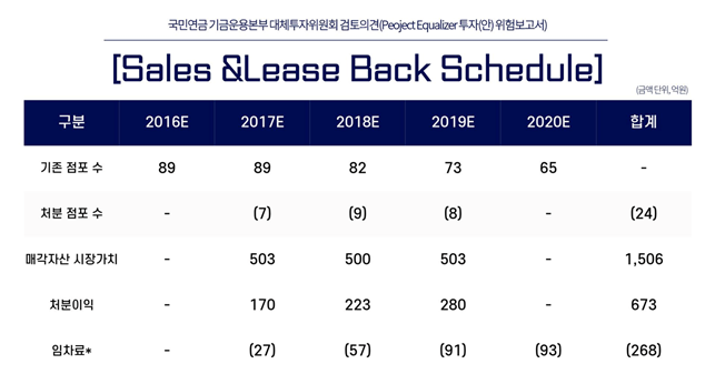 - MBK가 점포를 처분해서 이익을 얻겠다는 투자제안서의 내용으로 이런 식의 ‘부동산 장사’를 하겠다는 펀드에 투자하는 것이 기관투자자로서 적합하지 않음.