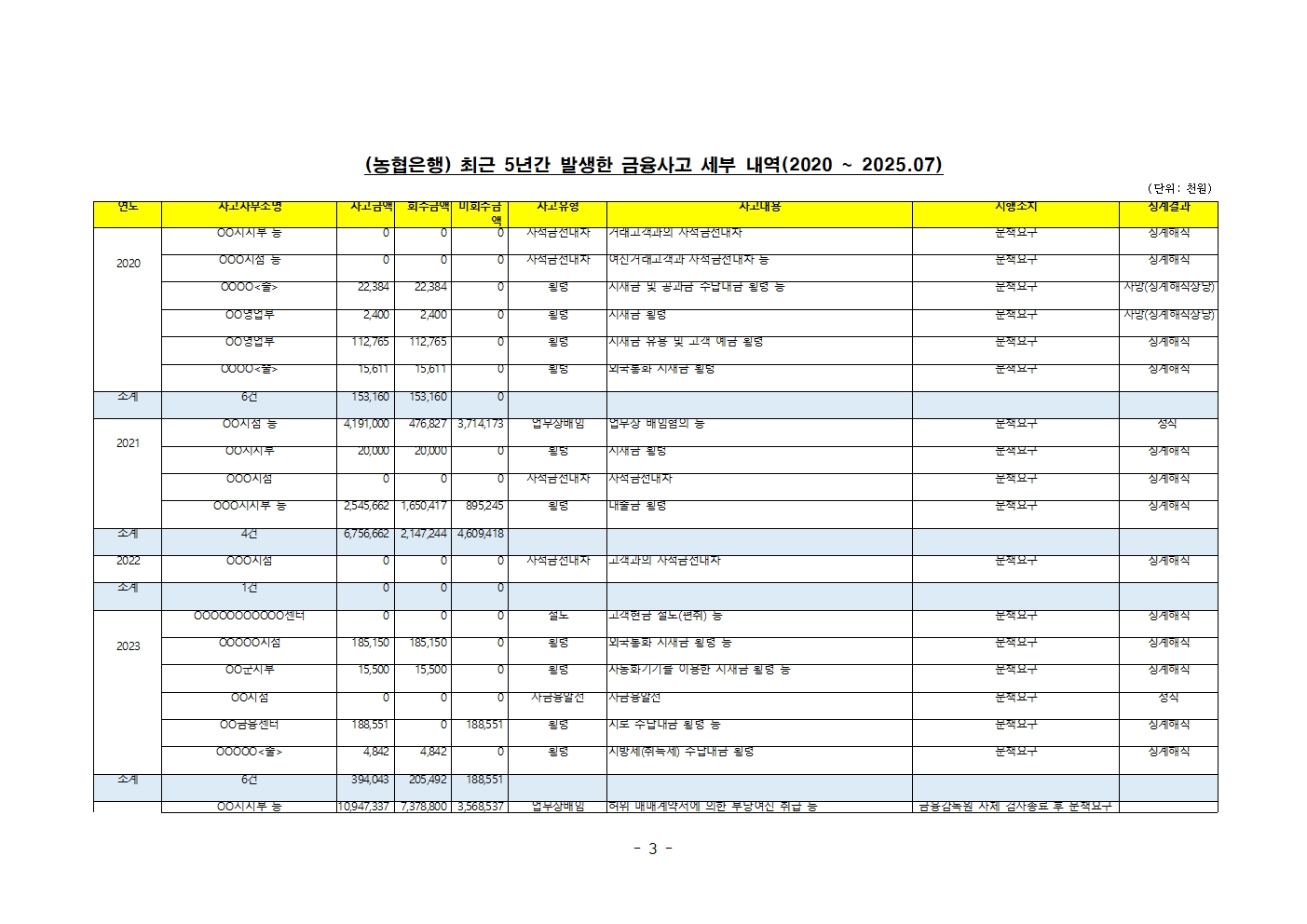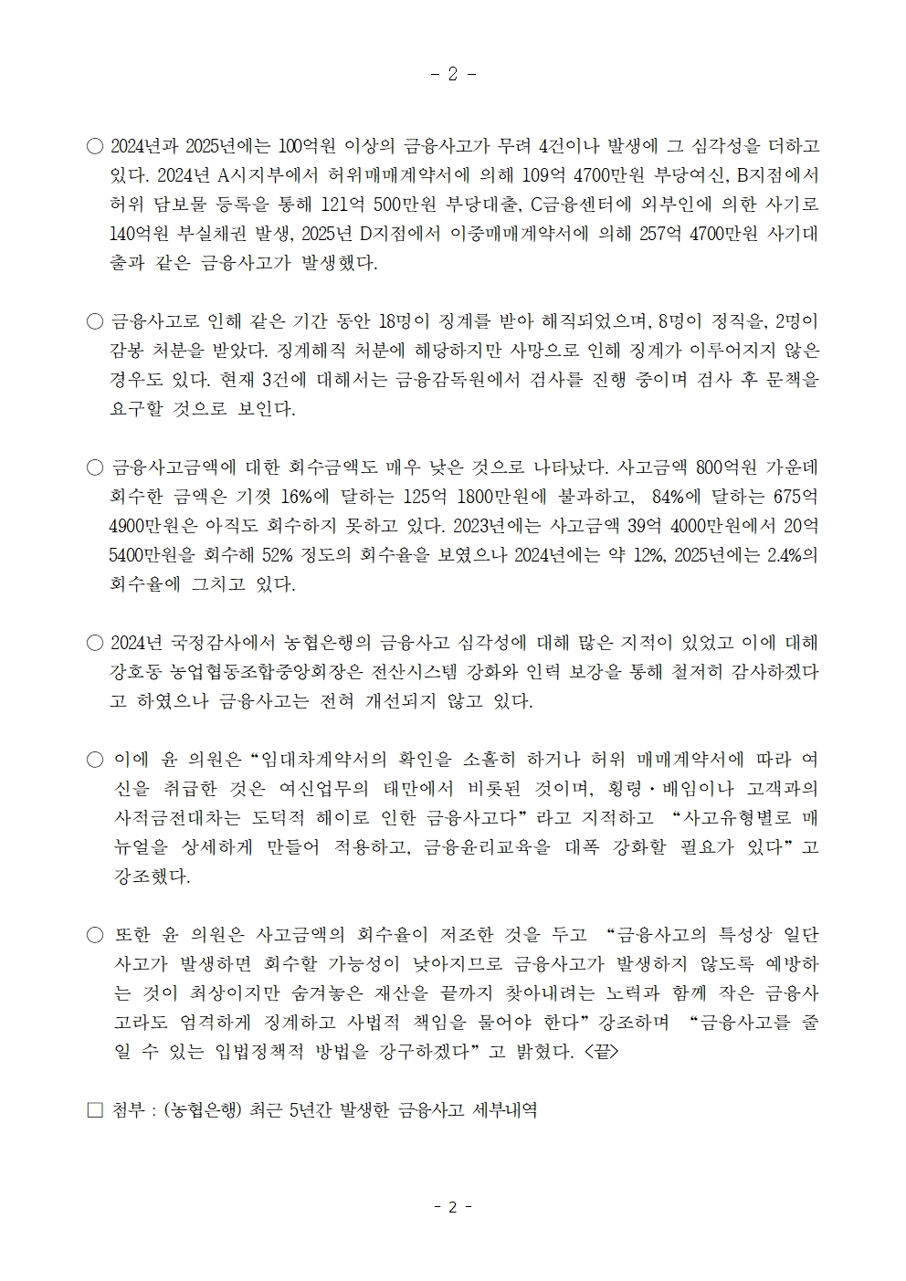 [윤준병 의원 국정감사 보도자료] 윤준병 의원, 농협은행 금융사고 심각, 4년 7개월간 800억 넘어