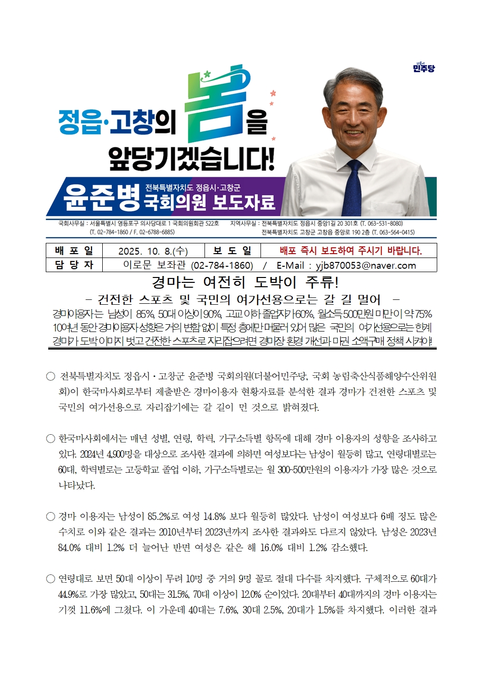 251008 [윤준병 의원 국정감사 보도자료] 경마는 여전히 도박이 주류! .hwp