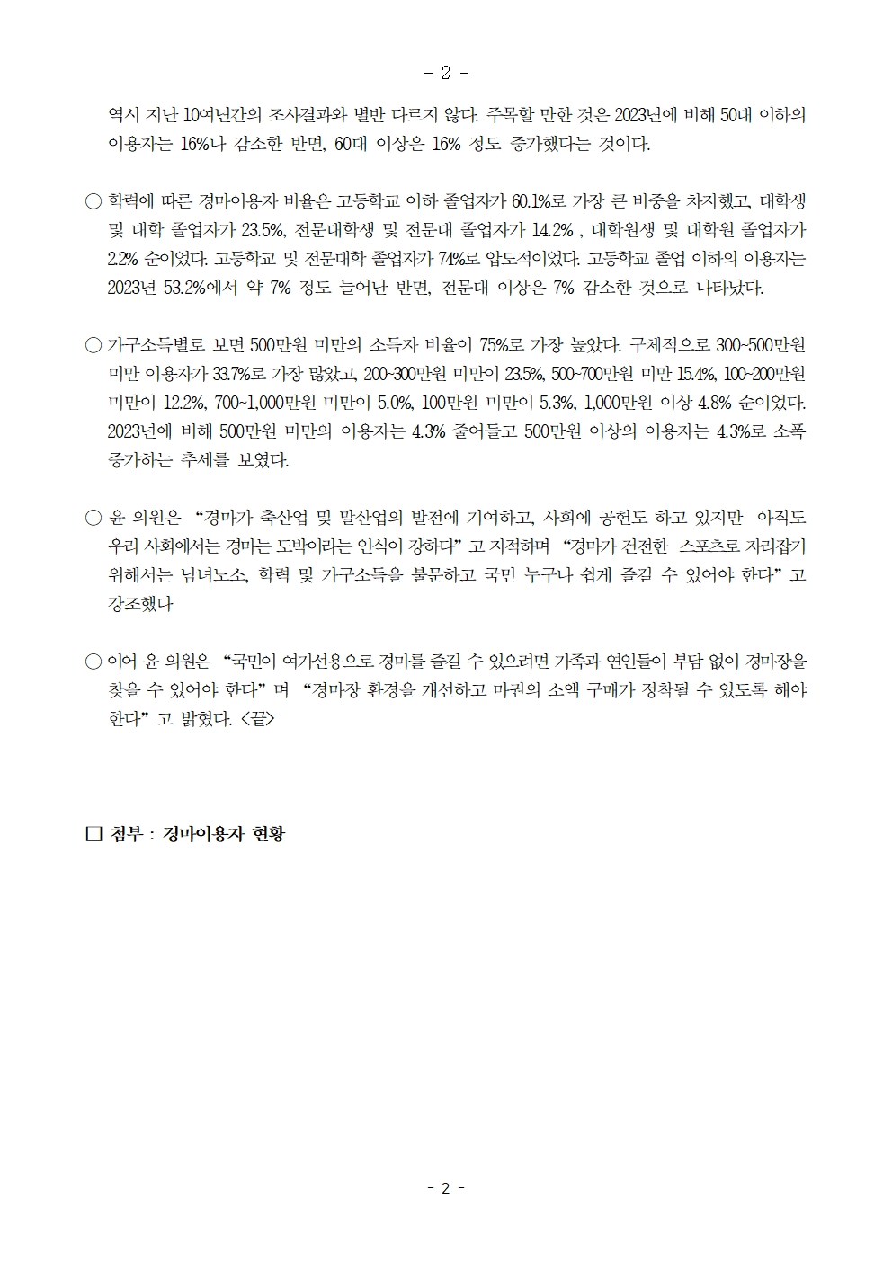 [윤준병 의원 국정감사 보도자료] 경마는 여전히 도박이 주류!