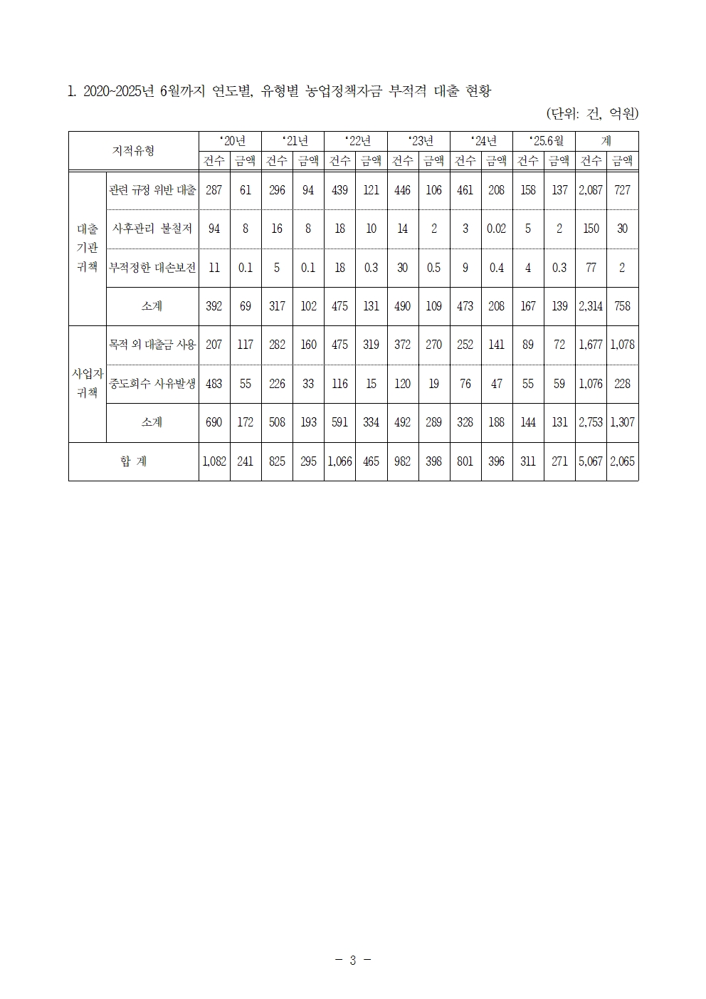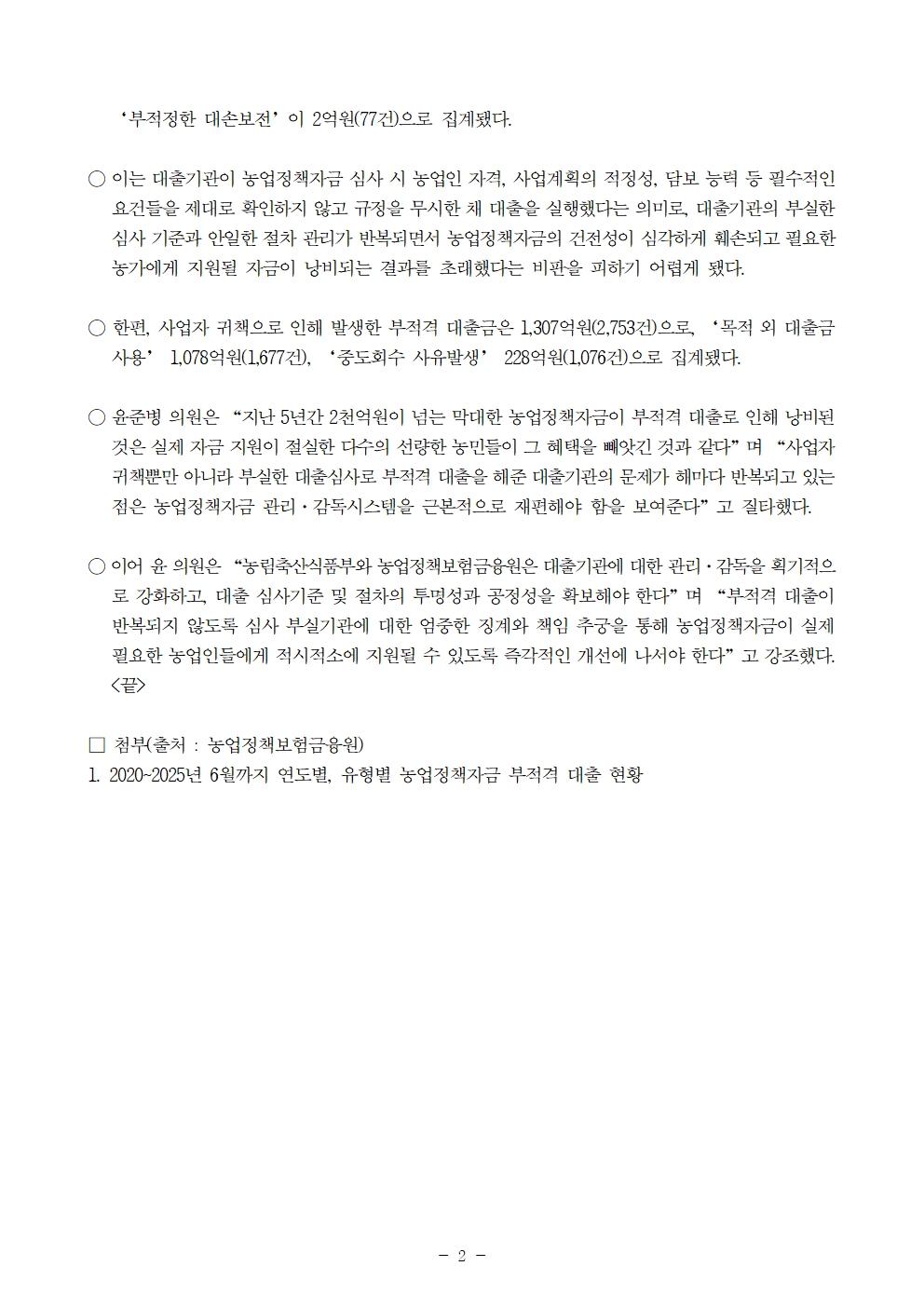 251011 [윤준병 의원 국정감사 보도자료] 5년간 농업정책자금 부적격대출 2천억원 넘어!.hwp