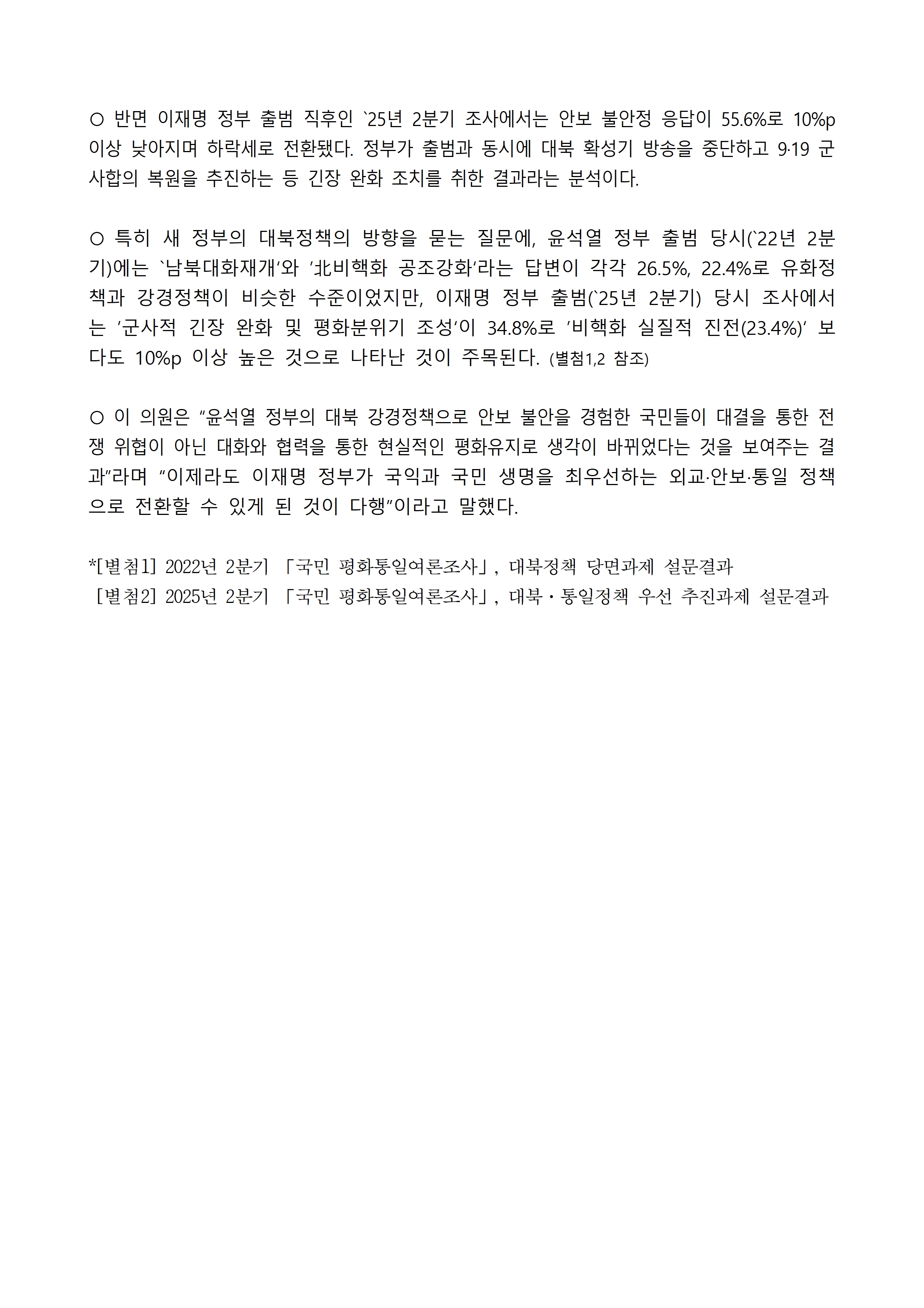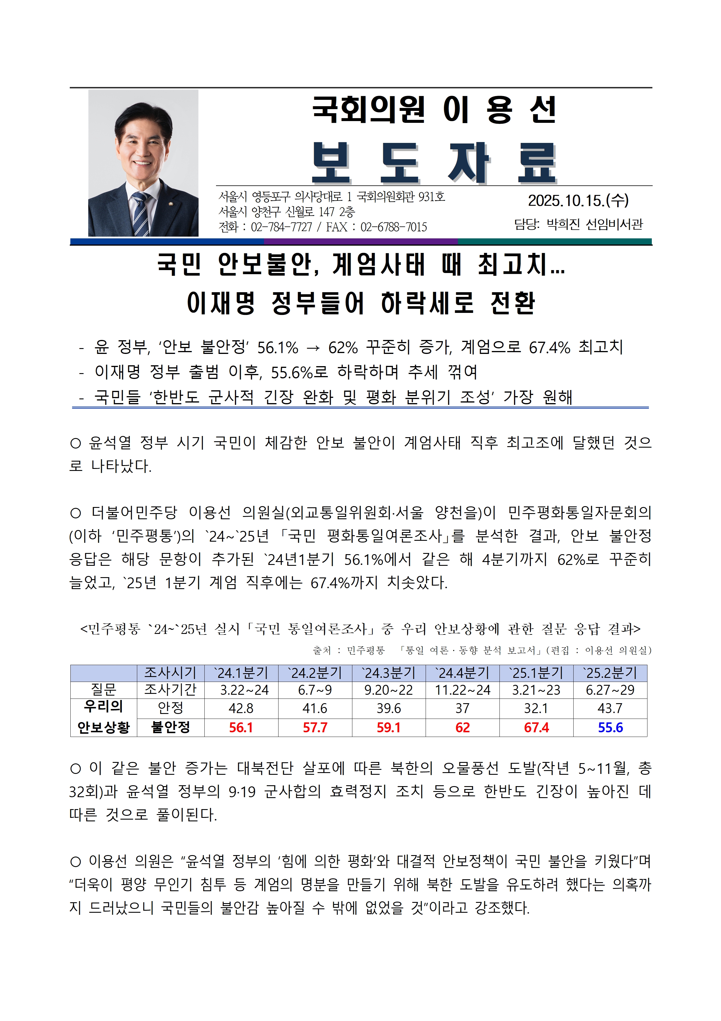 [이용선 국회의원 보도자료] 국민 안보불안, 계엄사태 때 최고치... 이재명 정부들어 하락세로 전환