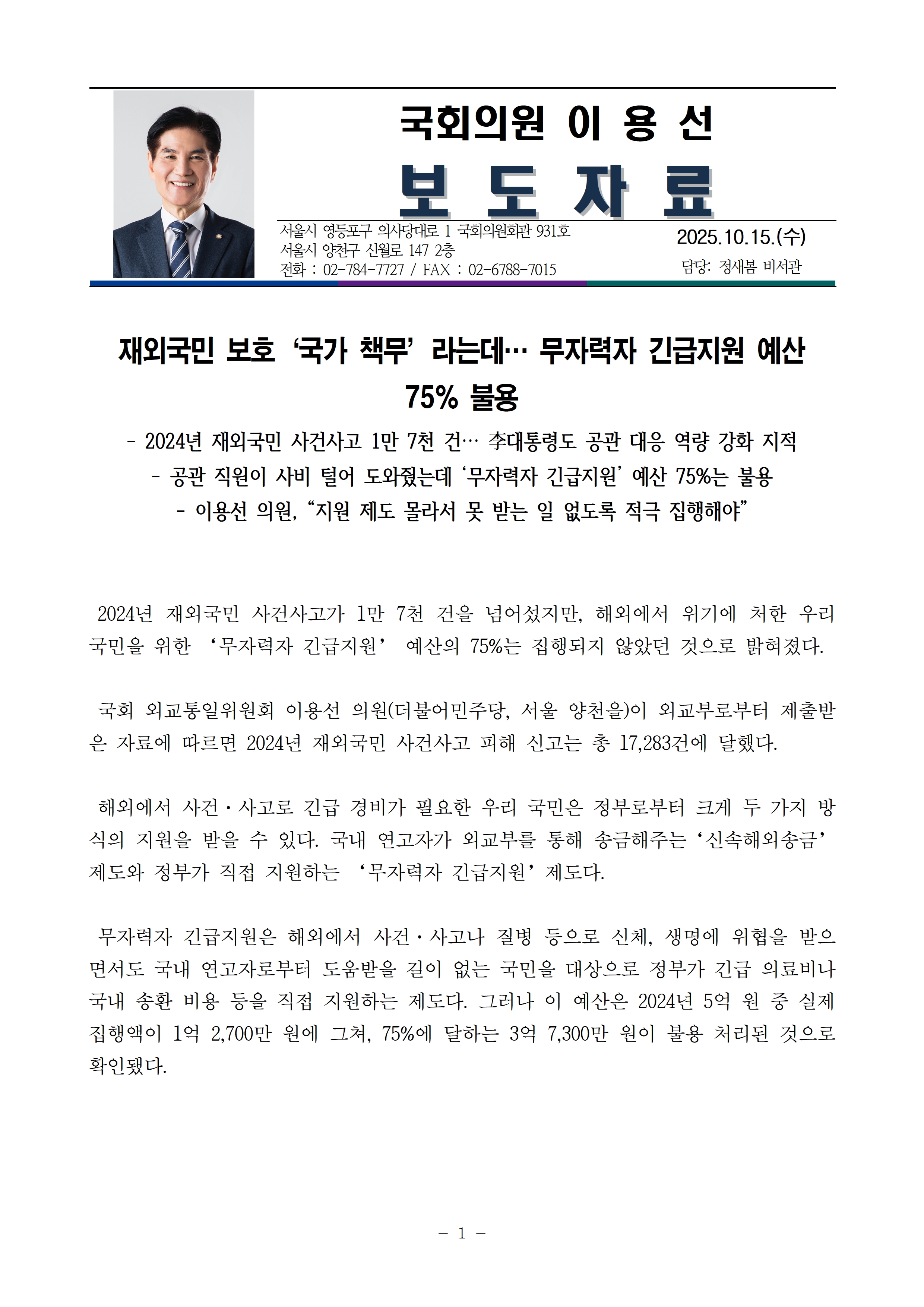 보도자료_251015_이용선의원_재외국민_보호_긴급지원불용.hwp