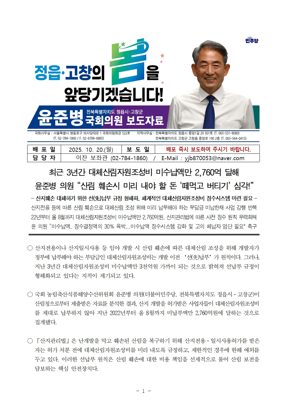 251020_[윤준병_의원_국정감사_보도자료]_최근_3년간_대체산림자원조성비_미수납액만_2_760억_달해001.jpg