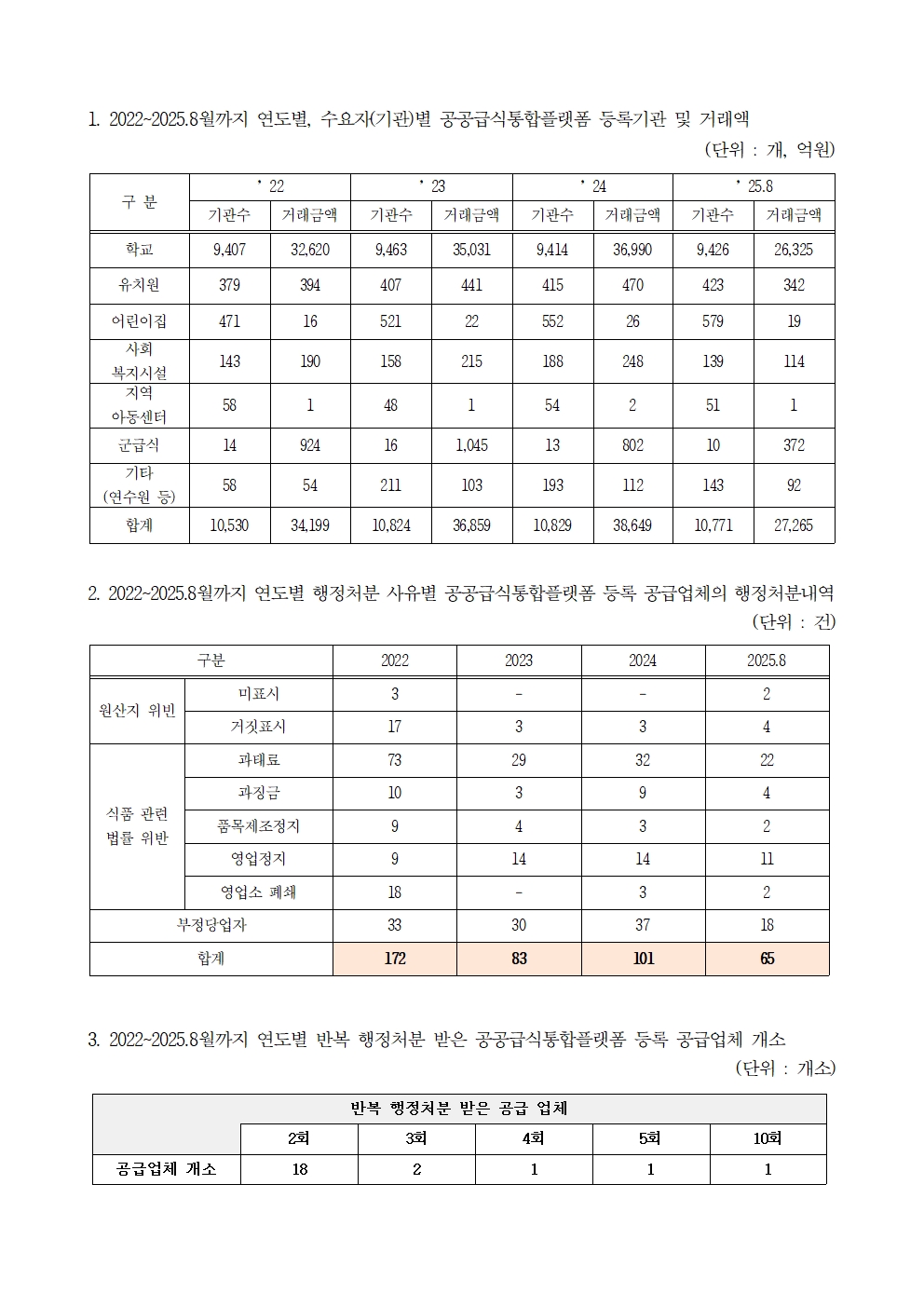 [윤준병 의원 국정감사 보도자료] 4조원 규모 aT 공공급식 통합플랫폼, 권한도·능력도 없는 총체적 부실 심각!