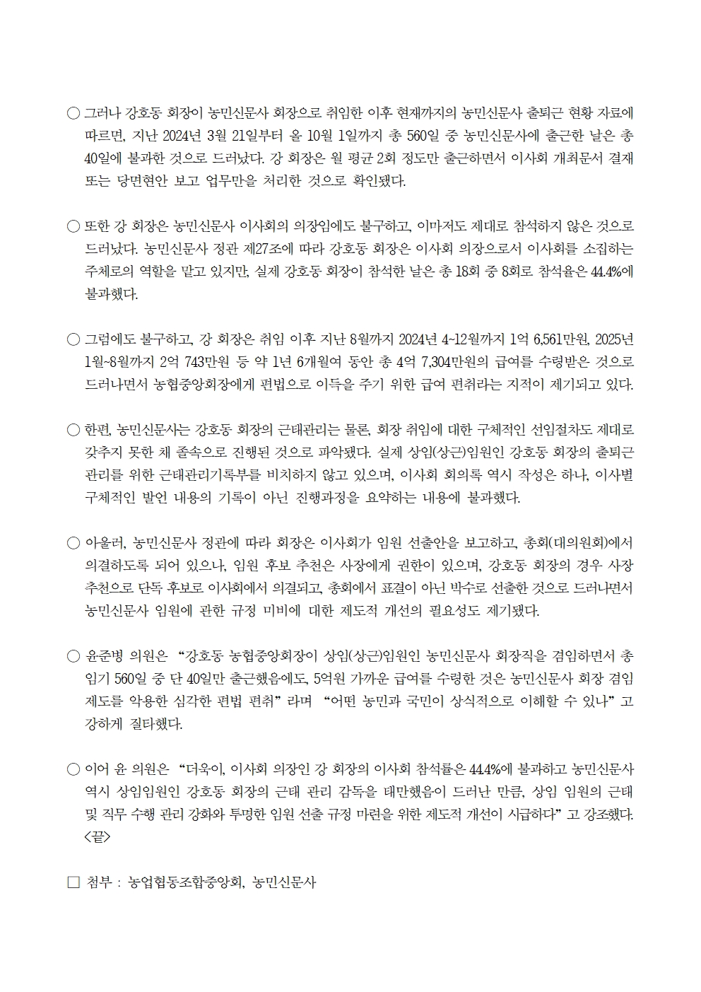 251024 [윤준병 의원 국정감사 보도자료] 강호동 농협회장 농민신문 회장 겸임하며 한 달만 출근하고 5억원 수령!.hwp