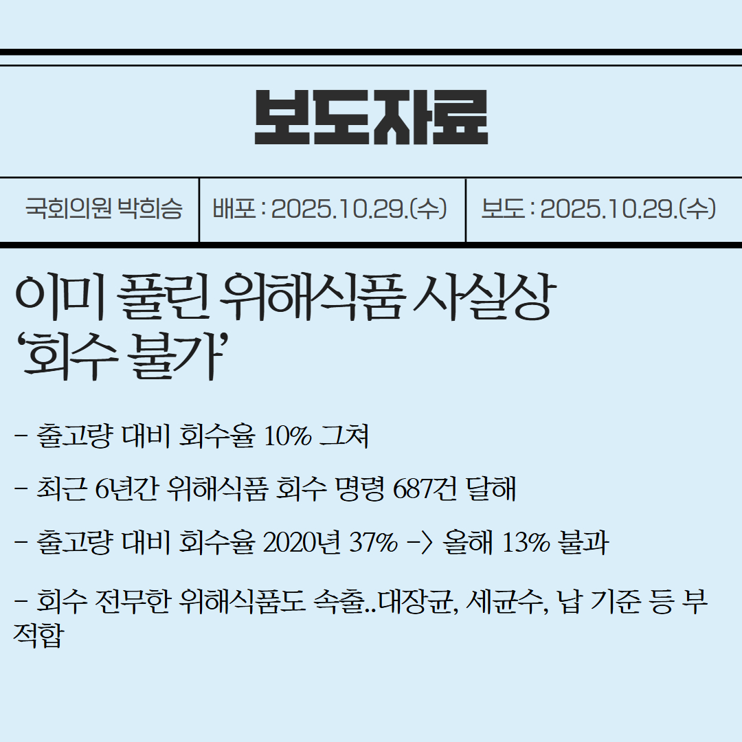 [국회의원 박희승 보도자료] 이미 풀린 위해식품 사실상 ‘회수 불가’